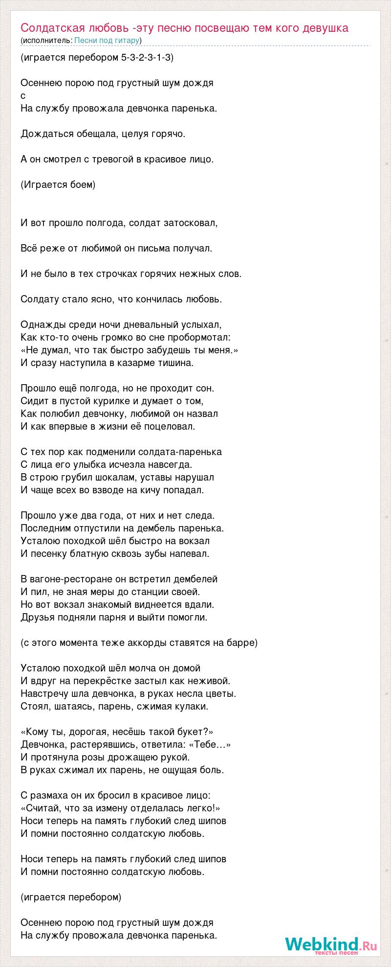 (играется перебором 5-3-2-3-1-3) Осеннею порою под грустный шум дождя c На службу провожала девчонка паренька. Дождаться обещала, целуя горячо. А он смотрел с тревогой в красивое лицо. (Играется боем) И вот прошло полгода, солдат затосковал, Всё реже от любимой он письма получал. И не было в тех строчках горячих нежных слов. Солдату стало ясно, что кончилась любовь. Однажды среди ночи дневальный услыхал, Как кто-то очень громко во сне пробормотал: «Не думал, что так быстро забудешь ты меня.» И сразу наступила в казарме тишина. Прошло ещё полгода, но не проходит сон. Сидит в пустой курилке и думает о том, Как полюбил девчонку, любимой он назвал И как впервые в жизни её поцеловал. С тех пор как подменили солдата-паренька С лица его улыбка исчезла навсегда. В строю грубил шокалам, уставы нарушал И чаще всех во взводе на кичу попадал. Прошло уже два года, от них и нет следа. Последним отпустили на дембель паренька. Усталою походкой шёл быстро на вокзал И песенку блатную сквозь зубы напевал. В вагоне-ресторане он встретил дембелей И пил, не зная меры до станции своей. Но вот вокзал знакомый виднеется вдали. Друзья подняли парня и выйти помогли. (с этого момента теже аккорды ставятся на барре) Усталою походкой шёл молча он домой И вдруг на перекрёстке застыл как неживой. Навстречу шла девчонка, в руках несла цветы. Стоял, шатаясь, парень, сжимая кулаки. «Кому ты, дорогая, несёшь такой букет?» Девчонка, растерявшись, ответила: «Тебе…» И протянула розы дрожащею рукой. В руках сжимал их парень, не ощущая боль. С размаха он их бросил в красивое лицо: «Считай, что за измену отделалась легко!» Носи теперь на память глубокий след шипов И помни постоянно солдатскую любовь. Носи теперь на память глубокий след шипов И помни постоянно солдатскую любовь. (играется перебором) Осеннею порою под грустный шум дождя На службу провожала девчонка паренька.