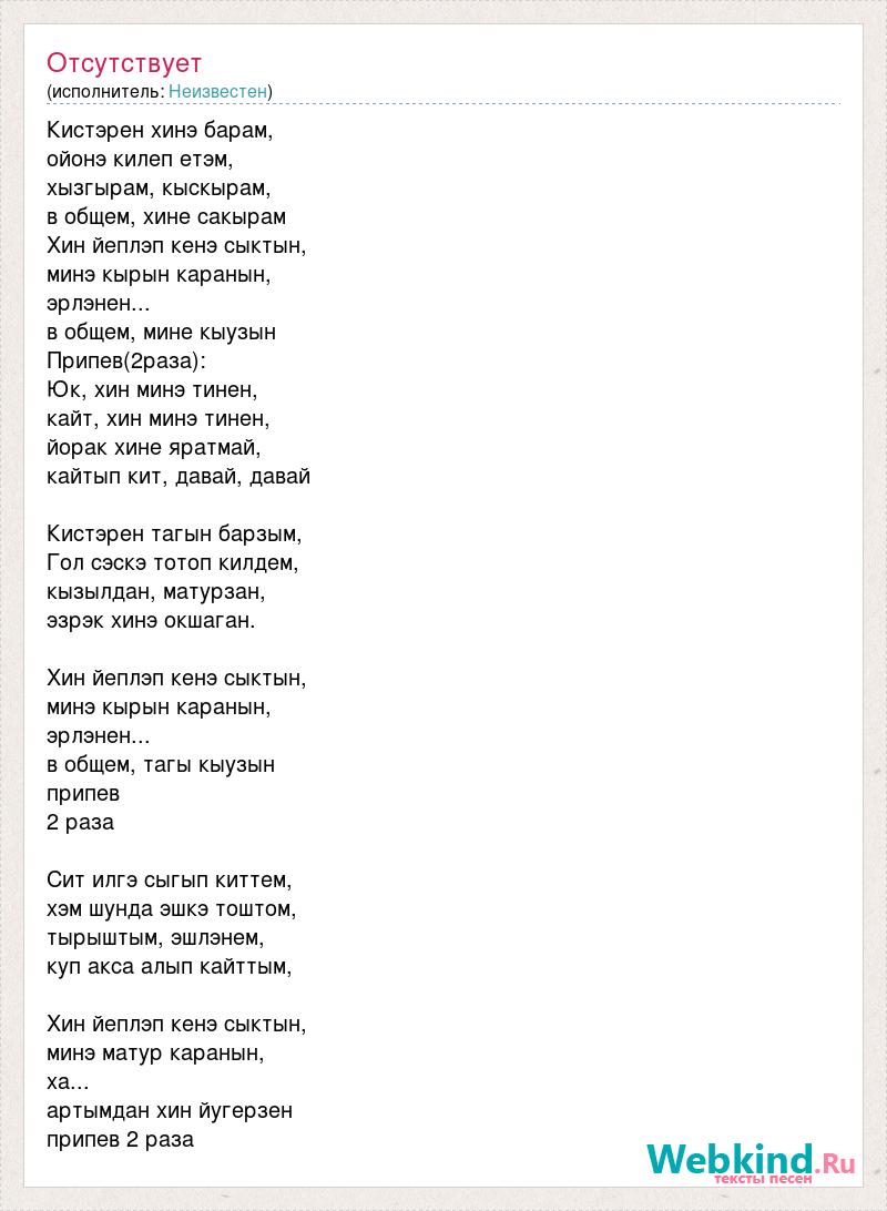 Кистэрен хинэ барам, ойонэ килеп етэм, хызгырам, кыскырам, в общем, хине сакырам Хин йеплэп кенэ сыктын, минэ кырын каранын, эрлэнен... в общем, мине кыузын Припев(2раза): Юк, хин минэ тинен, кайт, хин минэ тинен, йорак хине яратмай, кайтып кит, давай, давай Кистэрен тагын барзым, Гол сэскэ тотоп килдем, кызылдан, матурзан, эзрэк хинэ окшаган. Хин йеплэп кенэ сыктын, минэ кырын каранын, эрлэнен... в общем, тагы кыузын припев 2 раза Сит илгэ сыгып киттем, хэм шунда эшкэ тоштом, тырыштым, эшлэнем, куп акса алып кайттым, Хин йеплэп кенэ сыктын, минэ матур каранын, ха... артымдан хин йугерзен припев 2 раза