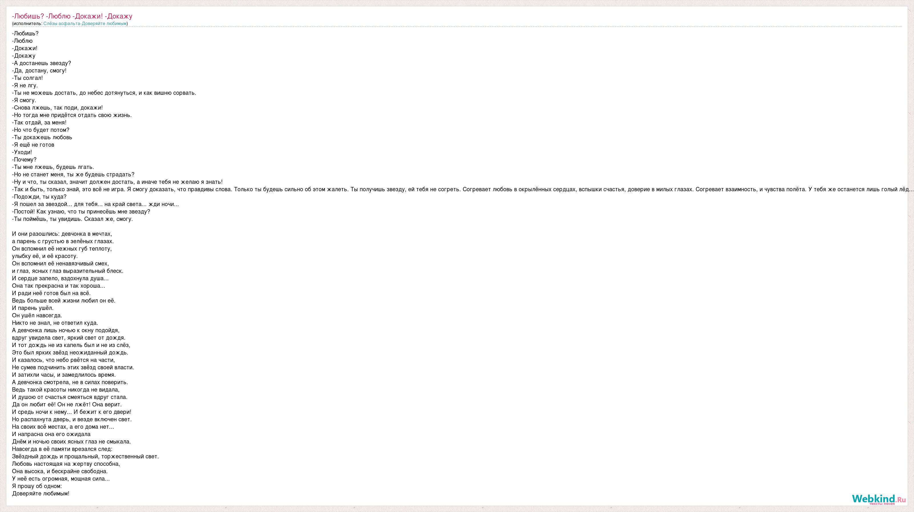 -Любишь? -Люблю -Докажи! -Докажу -А достанешь звезду? -Да, достану, смогу! -Ты солгал! -Я не лгу. -Ты не можешь достать, до небес дотянуться, и как вишню сорвать. -Я смогу. -Снова лжешь, так поди, докажи! -Но тогда мне придётся отдать свою жизнь. -Так отдай, за меня! -Но что будет потом? -Ты докажешь любовь -Я ещё не готов -Уходи! -Почему? -Ты мне лжешь, будешь лгать. -Но не станет меня, ты же будешь страдать? -Ну и что, ты сказал, значит должен достать, а иначе тебя не желаю я знать! -Так и быть, только знай, это всё не игра. Я смогу доказать, что правдивы слова. Только ты будешь сильно об этом жалеть. Ты получишь звезду, ей тебя не согреть. Согревает любовь в окрылённых сердцах, вспышки счастья, доверие в милых глазах. Согревает взаимность, и чувства полёта. У тебя же останется лишь голый лёд... -Подожди, ты куда? -Я пошел за звездой... для тебя... на край света... жди ночи... -Постой! Как узнаю, что ты принесёшь мне звезду? -Ты поймёшь, ты увидишь. Сказал же, смогу. И они разошлись: девчонка в мечтах, а парень с грустью в зелёных глазах. Он вспомнил её нежных губ теплоту, улыбку её, и её красоту. Он вспомнил её ненавязчивый смех, и глаз, ясных глаз выразительный блеск. И сердце запело, вздохнула душа... Она так прекрасна и так хороша... И ради неё готов был на всё. Ведь больше всей жизни любил он её. И парень ушёл. Он ушёл навсегда. Никто не знал, не ответил куда. А девчонка лишь ночью к окну подойдя, вдруг увидела свет, яркий свет от дождя. И тот дождь не из капель был и не из слёз, Это был ярких звёзд неожиданный дождь. И казалось, что небо рвётся на части, Не сумев подчинить этих звёзд своей власти. И затихли часы, и замедлилось время. А девчонка смотрела, не в силах поверить. Ведь такой красоты никогда не видала, И душою от счастья смеяться вдруг стала. Да он любит её! Он не лжёт! Она верит. И средь ночи к нему... И бежит к его двери! Но распахнута дверь, и везде включен свет. На своих всё местах, а его дома нет... И напрасна она его ожидала Днём и ночью своих ясных глаз не смыкала. Навсегда в её памяти врезался след: Звёздный дождь и прощальный, торжественный свет. Любовь настоящая на жертву способна, Она высока, и бескрайне свободна. У неё есть огромная, мощная сила... Я прошу об одном: Доверяйте любимым!