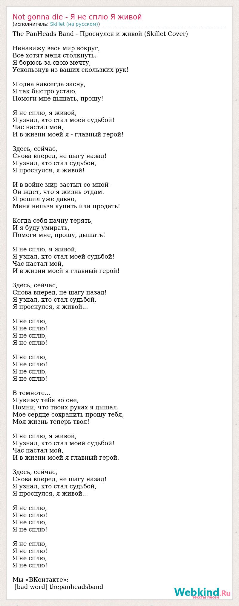 The PanHeads Band - Проснулся и живой (Skillet Cover) Ненавижу весь мир вокруг, Все хотят меня столкнуть. Я борюсь за свою мечту, Ускользнув из ваших скользких рук! Я одна навсегда засну, Я так быстро устаю, Помоги мне дышать, прошу! Я не сплю, я живой, Я узнал, кто стал моей судьбой! Час настал мой, И в жизни моей я - главный герой! Здесь, сейчас, Снова вперед, не шагу назад! Я узнал, кто стал судьбой, Я проснулся, я живой! И в войне мир застыл со мной - Он ждет, что я жизнь отдам. Я решил уже давно, Меня нельзя купить или продать! Когда себя начну терять, И я буду умирать, Помоги мне, прошу, дышать! Я не сплю, я живой, Я узнал, кто стал моей судьбой! Час настал мой, И в жизни моей я главный герой! Здесь, сейчас, Снова вперед, не шагу назад! Я узнал, кто стал судьбой, Я проснулся, я живой... Я не сплю, Я не сплю! Я не сплю, Я не сплю! Я не сплю, Я не сплю! Я не сплю, Я не сплю! В темноте... Я увижу тебя во сне, Помни, что твоих руках я дышал. Мое сердце сохранить прошу тебя, Моя жизнь теперь твоя! Я не сплю, я живой, Я узнал, кто стал моей судьбой! Час настал мой, И в жизни моей я главный герой. Здесь, сейчас, Снова вперед, не шагу назад! Я узнал, кто стал судьбой, Я проснулся, я живой... Я не сплю, Я не сплю! Я не сплю, Я не сплю! Я не сплю, Я не сплю! Я не сплю, Я не сплю! Мы «ВКонтакте»: [bad word] thepanheadsband