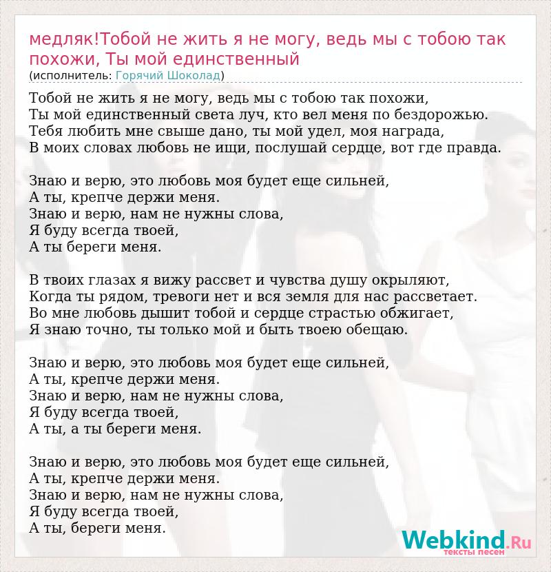 Тобой не жить я не могу, ведь мы с тобою так похожи, Ты мой единственный света луч, кто вел меня по бездорожью. Тебя любить мне свыше дано, ты мой удел, моя награда, В моих словах любовь не ищи, послушай сердце, вот где правда. Знаю и верю, это любовь моя будет еще сильней, А ты, крепче держи меня. Знаю и верю, нам не нужны слова, Я буду всегда твоей, А ты береги меня. В твоих глазах я вижу рассвет и чувства душу окрыляют, Когда ты рядом, тревоги нет и вся земля для нас рассветает. Во мне любовь дышит тобой и сердце страстью обжигает, Я знаю точно, ты только мой и быть твоею обещаю. Знаю и верю, это любовь моя будет еще сильней, А ты, крепче держи меня. Знаю и верю, нам не нужны слова, Я буду всегда твоей, А ты, а ты береги меня. Знаю и верю, это любовь моя будет еще сильней, А ты, крепче держи меня. Знаю и верю, нам не нужны слова, Я буду всегда твоей, А ты, береги меня.
