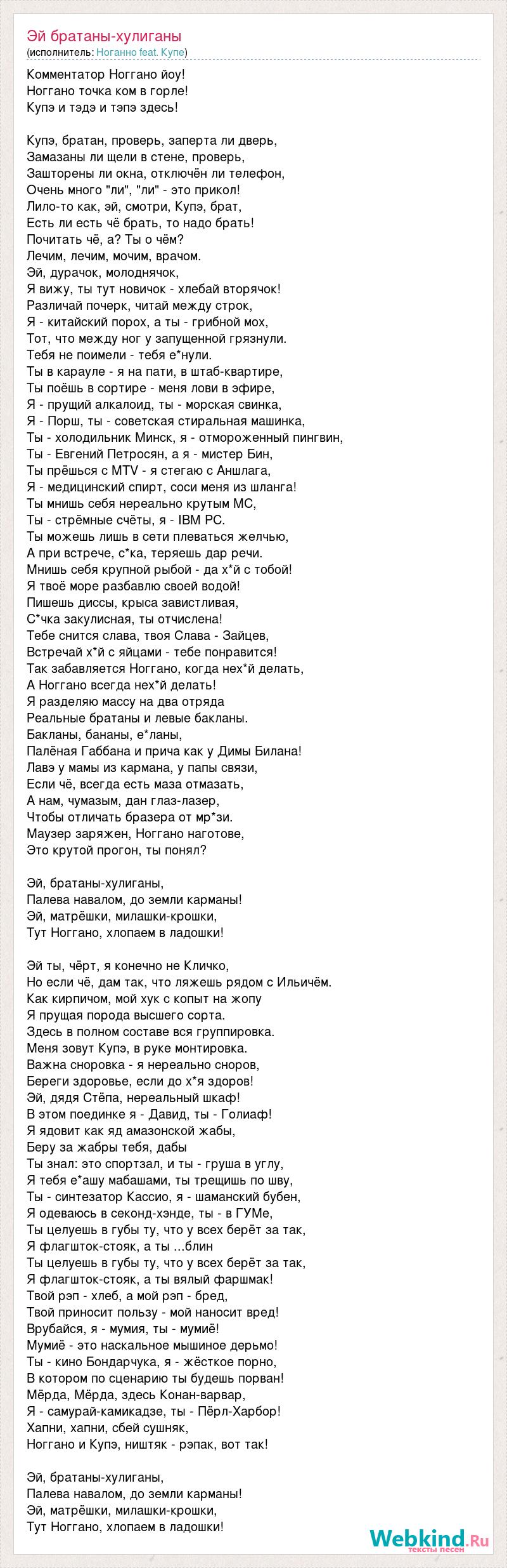 Комментатор Ноггано йоу! Ноггано точка ком в горле! Купэ и тэдэ и тэпэ здесь! Купэ, братан, проверь, заперта ли дверь, Замазаны ли щели в стене, проверь, Зашторены ли окна, отключён ли телефон, Очень много "ли", "ли" - это прикол! Лило-то как, эй, смотри, Купэ, брат, Есть ли есть чё брать, то надо брать! Почитать чё, а? Ты о чём? Лечим, лечим, мочим, врачом. Эй, дурачок, молоднячок, Я вижу, ты тут новичок - хлебай вторячок! Различай почерк, читай между строк, Я - китайский порох, а ты - грибной мох, Тот, что между ног у запущенной грязнули. Тебя не поимели - тебя е*нули. Ты в карауле - я на пати, в штаб-квартире, Ты поёшь в сортире - меня лови в эфире, Я - прущий алкалоид, ты - морская свинка, Я - Порш, ты - советская стиральная машинка, Ты - холодильник Минск, я - отмороженный пингвин, Ты - Евгений Петросян, а я - мистер Бин, Ты прёшься с MTV - я стегаю с Аншлага, Я - медицинский спирт, соси меня из шланга! Ты мнишь себя нереально крутым MC, Ты - стрёмные счёты, я - IBM PC. Ты можешь лишь в сети плеваться желчью, А при встрече, с*ка, теряешь дар речи. Мнишь себя крупной рыбой - да х*й с тобой! Я твоё море разбавлю своей водой! Пишешь диссы, крыса завистливая, С*чка закулисная, ты отчислена! Тебе снится слава, твоя Слава - Зайцев, Встречай х*й с яйцами - тебе понравится! Так забавляется Ноггано, когда нех*й делать, А Ноггано всегда нех*й делать! Я разделяю массу на два отряда Реальные братаны и левые бакланы. Бакланы, бананы, е*ланы, Палёная Габбана и прича как у Димы Билана! Лавэ у мамы из кармана, у папы связи, Если чё, всегда есть маза отмазать, А нам, чумазым, дан глаз-лазер, Чтобы отличать бразера от мр*зи. Маузер заряжен, Ноггано наготове, Это крутой прогон, ты понял? Эй, братаны-хулиганы, Палева навалом, до земли карманы! Эй, матрёшки, милашки-крошки, Тут Ноггано, хлопаем в ладошки! Эй ты, чёрт, я конечно не Кличко, Но если чё, дам так, что ляжешь рядом с Ильичём. Как кирпичом, мой хук с копыт на жопу Я прущая порода высшего сорта. Здесь в полном составе вся группировка. Меня зовут Купэ, в руке монтировка. Важна сноровка - я нереально сноров, Береги здоровье, если до х*я здоров! Эй, дядя Стёпа, нереальный шкаф! В этом поединке я - Давид, ты - Голиаф! Я ядовит как яд амазонской жабы, Беру за жабры тебя, дабы Ты знал: это спортзал, и ты - груша в углу, Я тебя е*ашу мабашами, ты трещишь по шву, Ты - синтезатор Кассио, я - шаманский бубен, Я одеваюсь в секонд-хэнде, ты - в ГУМе, Ты целуешь в губы ту, что у всех берёт за так, Я флагшток-стояк, а ты ...блин Ты целуешь в губы ту, что у всех берёт за так, Я флагшток-стояк, а ты вялый фаршмак! Твой рэп - хлеб, а мой рэп - бред, Твой приносит пользу - мой наносит вред! Врубайся, я - мумия, ты - мумиё! Мумиё - это наскальное мышиное дерьмо! Ты - кино Бондарчука, я - жёсткое порно, В котором по сценарию ты будешь порван! Мёрда, Мёрда, здесь Конан-варвар, Я - самурай-камикадзе, ты - Пёрл-Харбор! Хапни, хапни, сбей сушняк, Ноггано и Купэ, ништяк - рэпак, вот так! Эй, братаны-хулиганы, Палева навалом, до земли карманы! Эй, матрёшки, милашки-крошки, Тут Ноггано, хлопаем в ладошки!