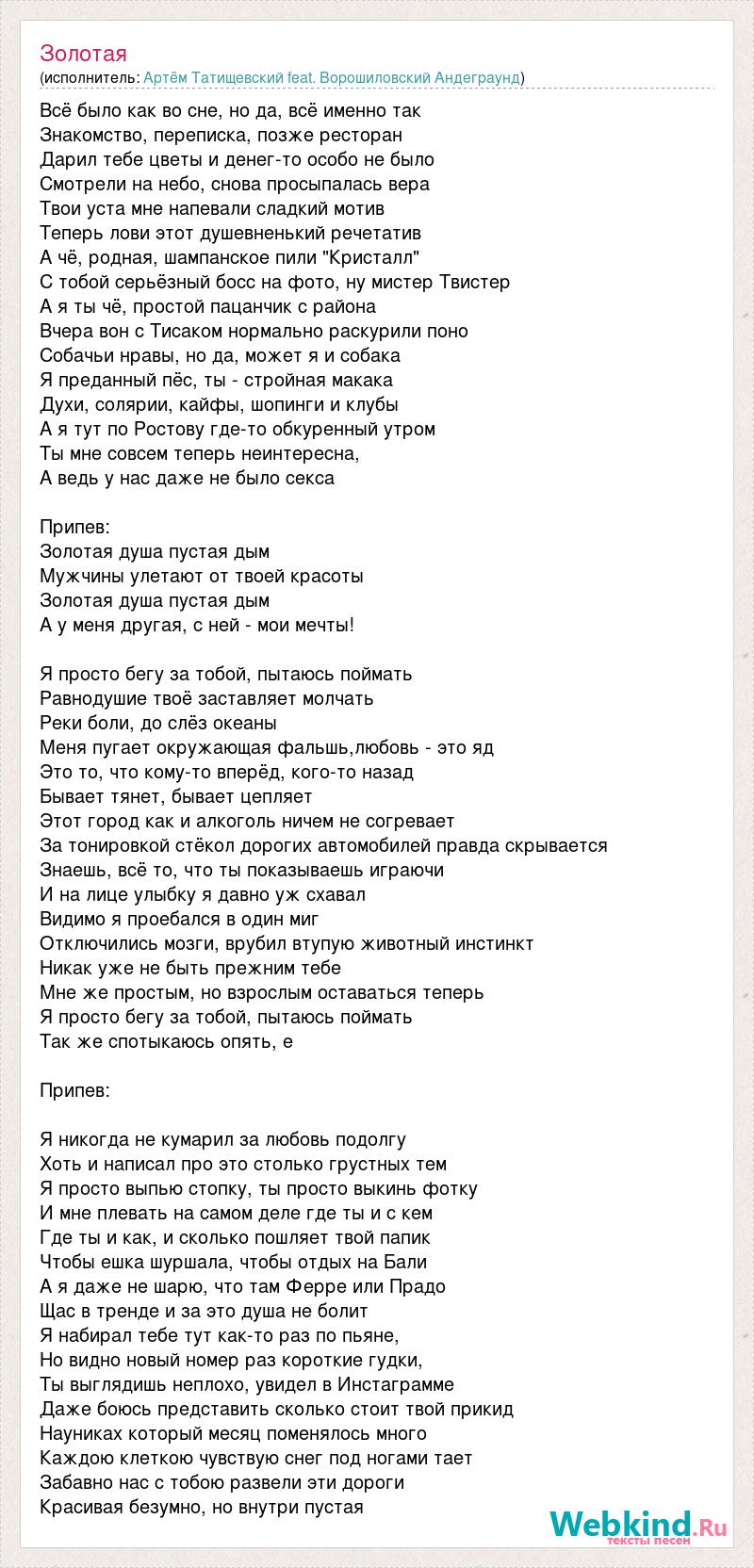 Всё было как во сне, но да, всё именно так Знакомство, переписка, позже ресторан Дарил тебе цветы и денег-то особо не было Смотрели на небо, снова просыпалась вера Твои уста мне напевали сладкий мотив Теперь лови этот душевненький речетатив А чё, родная, шампанское пили "Кристалл" С тобой серьёзный босс на фото, ну мистер Твистер А я ты чё, простой пацанчик с района Вчера вон с Тисаком нормально раскурили поно Собачьи нравы, но да, может я и собака Я преданный пёс, ты - стройная макака Духи, солярии, кайфы, шопинги и клубы А я тут по Ростову где-то обкуренный утром Ты мне совсем теперь неинтересна, А ведь у нас даже не было секса Припев: Золотая душа пустая дым Мужчины улетают от твоей красоты Золотая душа пустая дым А у меня другая, с ней - мои мечты! Я просто бегу за тобой, пытаюсь поймать Равнодушие твоё заставляет молчать Реки боли, до слёз океаны Меня пугает окружающая фальшь,любовь - это яд Это то, что кому-то вперёд, кого-то назад Бывает тянет, бывает цепляет Этот город как и алкоголь ничем не согревает За тонировкой стёкол дорогих автомобилей правда скрывается Знаешь, всё то, что ты показываешь играючи И на лице улыбку я давно уж схавал Видимо я проебался в один миг Отключились мозги, врубил втупую животный инстинкт Никак уже не быть прежним тебе Мне же простым, но взрослым оставаться теперь Я просто бегу за тобой, пытаюсь поймать Так же спотыкаюсь опять, е Припев: Я никогда не кумарил за любовь подолгу Хоть и написал про это столько грустных тем Я просто выпью стопку, ты просто выкинь фотку И мне плевать на самом деле где ты и с кем Где ты и как, и сколько пошляет твой папик Чтобы ешка шуршала, чтобы отдых на Бали А я даже не шарю, что там Ферре или Прадо Щас в тренде и за это душа не болит Я набирал тебе тут как-то раз по пьяне, Но видно новый номер раз короткие гудки, Ты выглядишь неплохо, увидел в Инстаграмме Даже боюсь представить сколько стоит твой прикид Науниках который месяц поменялось много Каждою клеткою чувствую снег под ногами тает Забавно нас с тобою развели эти дороги Красивая безумно, но внутри пустая