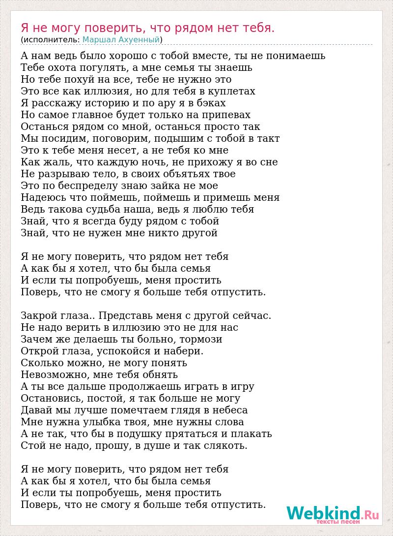 А нам ведь было хорошо с тобой вместе, ты не понимаешь Тебе охота погулять, а мне семья ты знаешь Но тебе похуй на все, тебе не нужно это Это все как иллюзия, но для тебя в куплетах Я расскажу историю и по ару я в бэках Но самое главное будет только на припевах Останься рядом со мной, останься просто так Мы посидим, поговорим, подышим с тобой в такт Это к тебе меня несет, а не тебя ко мне Как жаль, что каждую ночь, не прихожу я во сне Не разрываю тело, в своих объятьях твое Это по беспределу знаю зайка не мое Надеюсь что поймешь, поймешь и примешь меня Ведь такова судьба наша, ведь я люблю тебя Знай, что я всегда буду рядом с тобой Знай, что не нужен мне никто другой Я не могу поверить, что рядом нет тебя А как бы я хотел, что бы была семья И если ты попробуешь, меня простить Поверь, что не смогу я больше тебя отпустить. Закрой глаза.. Представь меня с другой сейчас. Не надо верить в иллюзию это не для нас Зачем же делаешь ты больно, тормози Открой глаза, успокойся и набери. Сколько можно, не могу понять Невозможно, мне тебя обнять А ты все дальше продолжаешь играть в игру Остановись, постой, я так больше не могу Давай мы лучше помечтаем глядя в небеса Мне нужна улыбка твоя, мне нужны слова А не так, что бы в подушку прятаться и плакать Стой не надо, прошу, в душе и так слякоть. Я не могу поверить, что рядом нет тебя А как бы я хотел, что бы была семья И если ты попробуешь, меня простить Поверь, что не смогу я больше тебя отпустить.