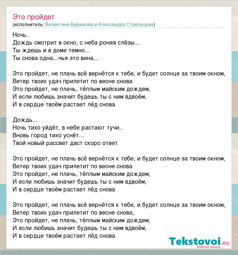 Ночь.. Дождь смотрит в окно, с неба роняя слёзы... Ты ждешь и в доме темно... Ты снова одна...чья это вина... Это пройдет, не плачь всё вернётся к тебе, и будет солнце за твоим окном, Ветер твоих удач прилетит по весне снова Это пройдет, не плачь, тёплым майским дождем, И если любишь значит будешь ты с ним вдвоём, И в сердце твоём растает лёд снова Дождь... Ночь тихо уйдёт, в небе растают тучи.. Вновь город тихо уснёт... Твой новый рассвет даст скоро ответ Это пройдет, не плачь всё вернётся к тебе, и будет солнце за твоим окном, Ветер твоих удач прилетит по весне снова Это пройдет, не плачь, тёплым майским дождем, И если любишь значит будешь ты с ним вдвоём, И в сердце твоём растает лёд снова Это пройдет, не плачь всё вернётся к тебе, и будет солнце за твоим окном, Ветер твоих удач прилетит по весне снова, Это пройдет, не плачь, тёплым майским дождем, И если любишь значит будешь ты с ним вдвоём, И в сердце твоём растает лёд снова