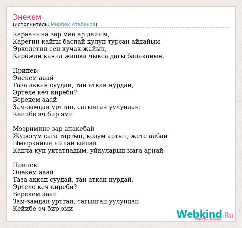 Караанына зар мен ар дайым, Карегин кайгы баспай кулуп турсан айдайым. Эркелетип сен кучак жайып, Каражан канча жашка чыкса дагы балакайын. Припев: Энекем ааай Таза аккан суудай, тан аткан нурдай, Эртеле кеч киреби? Берекем ааай Зам-замдан урттап, сагынган уулундан: Кейибе эч бир эми Мээримине зар апакебай Журогум сага тартып, козум артып, жете албай Ымыркайын ыйлай ыйлай Канча кун уктатпадым, уйкуларын мага арнай Припев: Энекем ааай Таза аккан суудай, тан аткан нурдай, Эртеле кеч киреби? Берекем ааай Зам-замдан урттап, сагынган уулундан: Кейибе эч бир эми