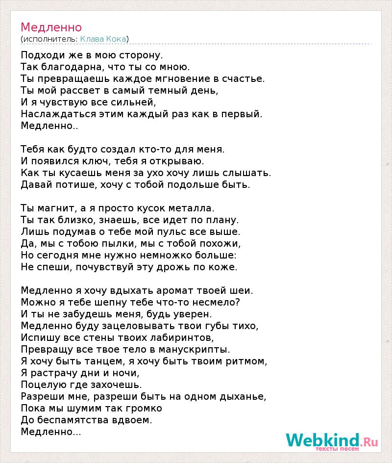 Подходи же в мою сторону. Так благодарна, что ты со мною. Ты превращаешь каждое мгновение в счастье. Ты мой рассвет в самый темный день, И я чувствую все сильней, Наслаждаться этим каждый раз как в первый. Медленно.. Тебя как будто создал кто-то для меня. И появился ключ, тебя я открываю. Как ты кусаешь меня за ухо хочу лишь слышать. Давай потише, хочу с тобой подольше быть. Ты магнит, а я просто кусок металла. Ты так близко, знаешь, все идет по плану. Лишь подумав о тебе мой пульс все выше. Да, мы с тобою пылки, мы с тобой похожи, Но сегодня мне нужно немножко больше: Не спеши, почувствуй эту дрожь по коже. Медленно я хочу вдыхать аромат твоей шеи. Можно я тебе шепну тебе что-то несмело? И ты не забудешь меня, будь уверен. Медленно буду зацеловывать твои губы тихо, Испишу все стены твоих лабиринтов, Превращу все твое тело в манускрипты. Я хочу быть танцем, я хочу быть твоим ритмом, Я растрачу дни и ночи, Поцелую где захочешь. Разреши мне, разреши быть на одном дыханье, Пока мы шумим так громко До беспамятства вдвоем. Медленно...