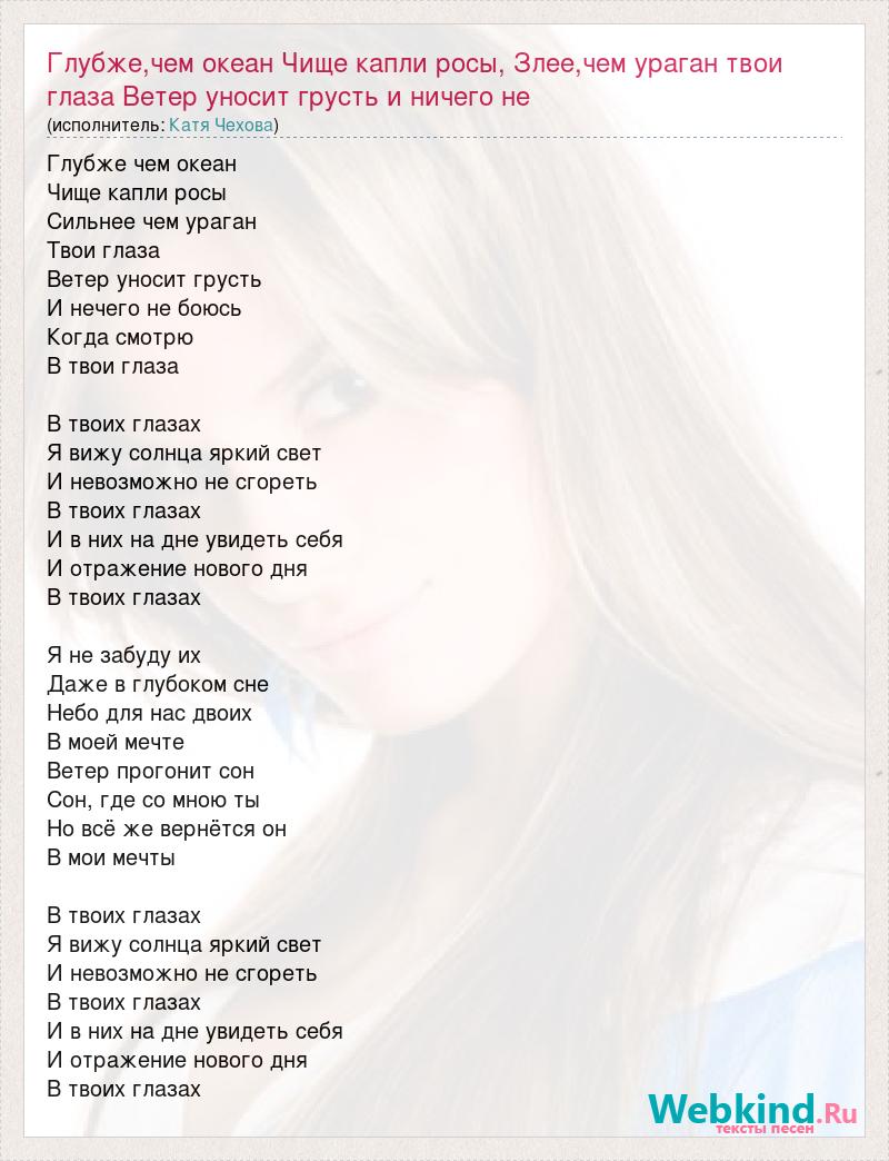Главная→Исполнители→Катя Чехова→Глубже,чем океан Чище капли росы, Злее,чем ураган твои глаза Ветер уносит гр