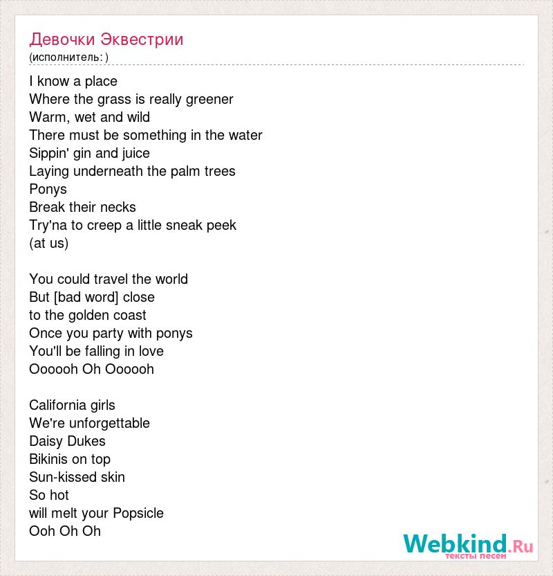I know a place Where the grass is really greener Warm, wet and wild There must be something in the water Sippin' gin and juice Laying underneath the palm trees Ponys Break their necks Try'na to creep a little sneak peek (at us) You could travel the world But [bad word] close to the golden coast Once you party with ponys You'll be falling in love Oooooh Oh Oooooh California girls We're unforgettable Daisy Dukes Bikinis on top Sun-kissed skin So hot will melt your Popsicle Ooh Oh Oh