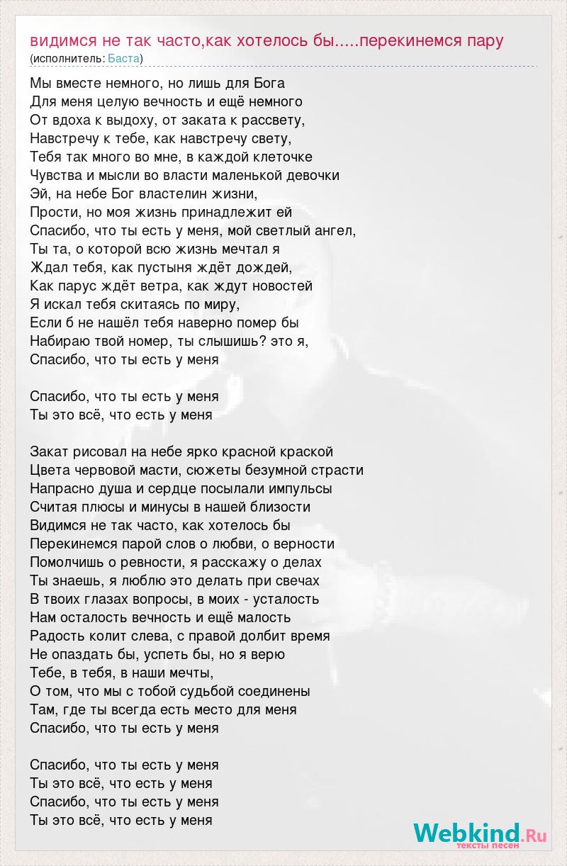 Мы вместе немного, но лишь для Бога Для меня целую вечность и ещё немного От вдоха к выдоху, от заката к рассвету, Навстречу к тебе, как навстречу свету, Тебя так много во мне, в каждой клеточке Чувства и мысли во власти маленькой девочки Эй, на небе Бог властелин жизни, Прости, но моя жизнь принадлежит ей Спасибо, что ты есть у меня, мой светлый ангел, Ты та, о которой всю жизнь мечтал я Ждал тебя, как пустыня ждёт дождей, Как парус ждёт ветра, как ждут новостей Я искал тебя скитаясь по миру, Если б не нашёл тебя наверно помер бы Набираю твой номер, ты слышишь? это я, Спасибо, что ты есть у меня Спасибо, что ты есть у меня Ты это всё, что есть у меня Закат рисовал на небе ярко красной краской Цвета червовой масти, сюжеты безумной страсти Напрасно душа и сердце посылали импульсы Считая плюсы и минусы в нашей близости Видимся не так часто, как хотелось бы Перекинемся парой слов о любви, о верности Помолчишь о ревности, я расскажу о делах Ты знаешь, я люблю это делать при свечах В твоих глазах вопросы, в моих - усталость Нам осталость вечность и ещё малость Радость колит слева, с правой долбит время Не опаздать бы, успеть бы, но я верю Тебе, в тебя, в наши мечты, О том, что мы с тобой судьбой соединены Там, где ты всегда есть место для меня Спасибо, что ты есть у меня Спасибо, что ты есть у меня Ты это всё, что есть у меня Спасибо, что ты есть у меня Ты это всё, что есть у меня