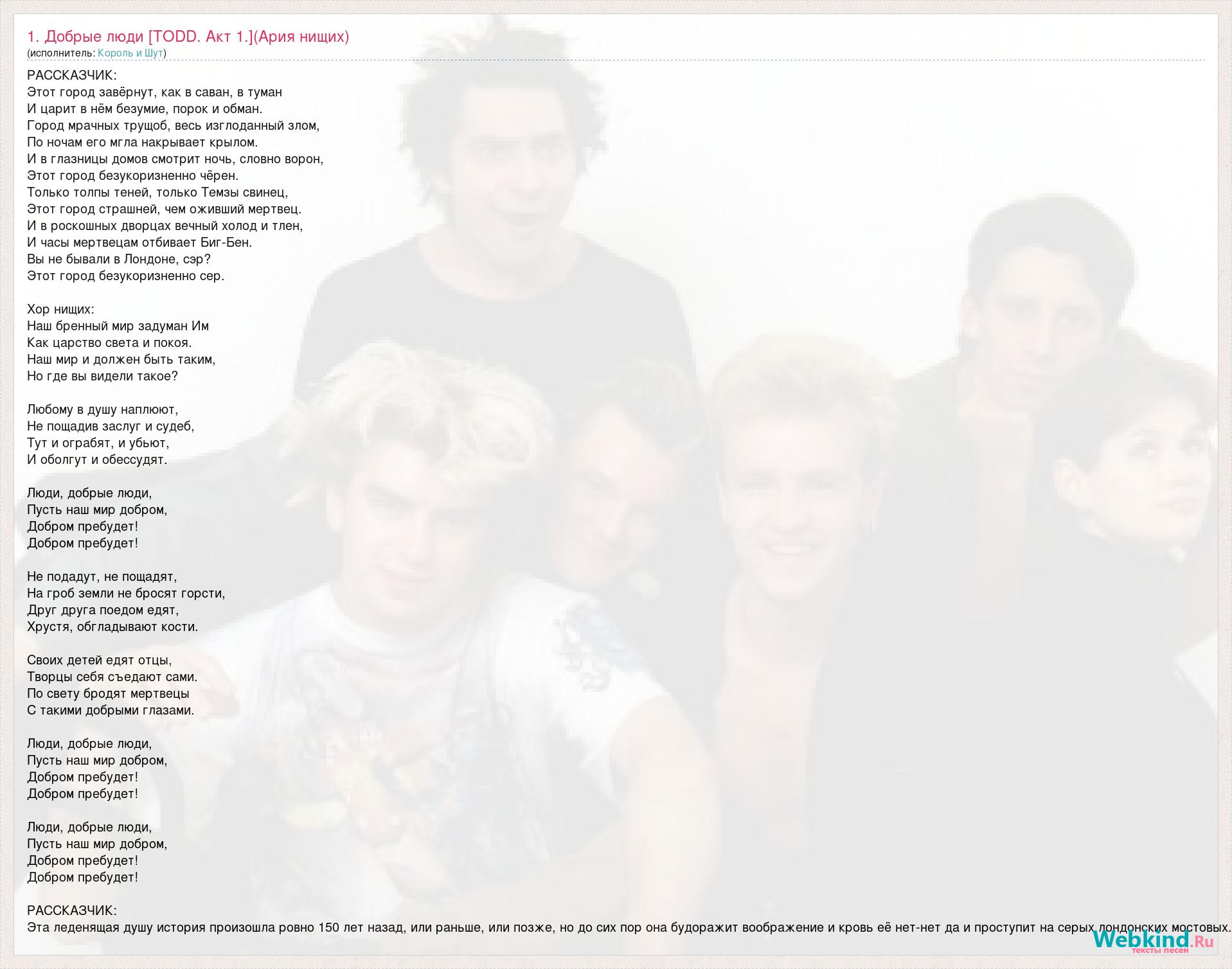 РАССКАЗЧИК: Этот город завёрнут, как в саван, в туман И царит в нём безумие, порок и обман. Город мрачных трущоб, весь изглоданный злом, По ночам его мгла накрывает крылом. И в глазницы домов смотрит ночь, словно ворон, Этот город безукоризненно чёрен. Только толпы теней, только Темзы свинец, Этот город страшней, чем оживший мертвец. И в роскошных дворцах вечный холод и тлен, И часы мертвецам отбивает Биг-Бен. Вы не бывали в Лондоне, сэр? Этот город безукоризненно сер. Хор нищих: Наш бренный мир задуман Им Как царство света и покоя. Наш мир и должен быть таким, Но где вы видели такое? Любому в душу наплюют, Не пощадив заслуг и судеб, Тут и ограбят, и убьют, И оболгут и обессудят. Люди, добрые люди, Пусть наш мир добром, Добром пребудет! Добром пребудет! Не подадут, не пощадят, На гроб земли не бросят горсти, Друг друга поедом едят, Хрустя, обгладывают кости. Своих детей едят отцы, Творцы себя съедают сами. По свету бродят мертвецы С такими добрыми глазами. Люди, добрые люди, Пусть наш мир добром, Добром пребудет! Добром пребудет! Люди, добрые люди, Пусть наш мир добром, Добром пребудет! Добром пребудет! РАССКАЗЧИК: Эта леденящая душу история произошла ровно 150 лет назад, или раньше, или позже, но до сих пор она будоражит воображение и кровь её нет-нет да и проступит на серых лондонских мостовых.