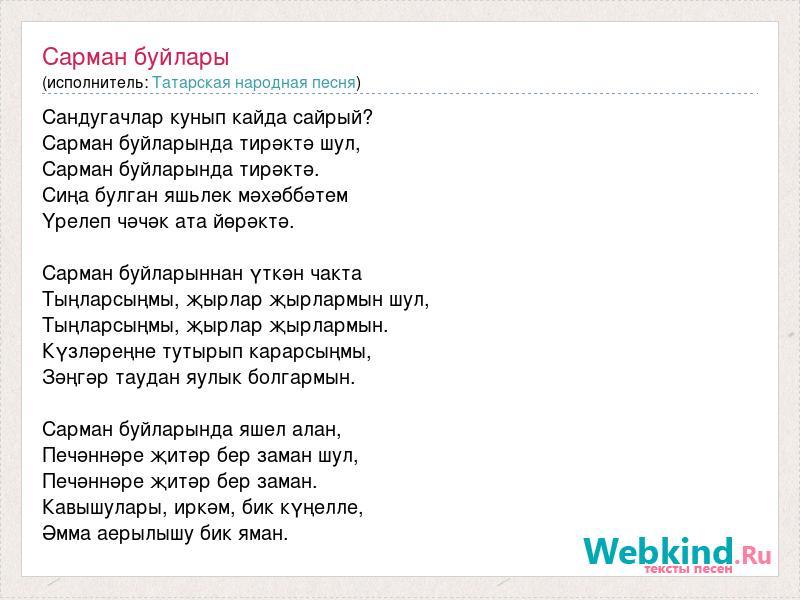 Сандугачлар кунып кайда сайрый? Сарман буйларында тирәктә шул, Сарман буйларында тирәктә. Сиңа булган яшьлек мәхәббәтем Үрелеп чәчәк ата йөрәктә. Сарман буйларыннан үткән чакта Тыңларсыңмы, җырлар җырлармын шул, Тыңларсыңмы, җырлар җырлармын. Күзләреңне тутырып карарсыңмы, Зәңгәр таудан яулык болгармын. Сарман буйларында яшел алан, Печәннәре җитәр бер заман шул, Печәннәре җитәр бер заман. Кавышулары, иркәм, бик күңелле, Әмма аерылышу бик яман.