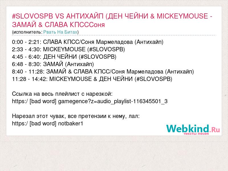 0:00 - 2:21: СЛАВА КПСС/Соня Мармеладова (Антихайп) 2:33 - 4:30: MICKEYMOUSE (#SLOVOSPB) 4:45 - 6:40: ДЕН ЧЕЙНИ (#SLOVOSPB) 6:48 - 8:30: ЗАМАЙ (Антихайп) 8:40 - 11:28: ЗАМАЙ & СЛАВА КПСС/Соня Мармеладова (Антихайп) 11:28 - 14:42: MICKEYMOUSE & ДЕН ЧЕЙНИ (#SLOVOSPB) Ссылка на весь плейлист с нарезкой: https:/ [bad word] gamegence?z=audio_playlist-116345501_3 Нарезал этот чувак, все претензии к нему, лал: https:/ [bad word] notbaker1