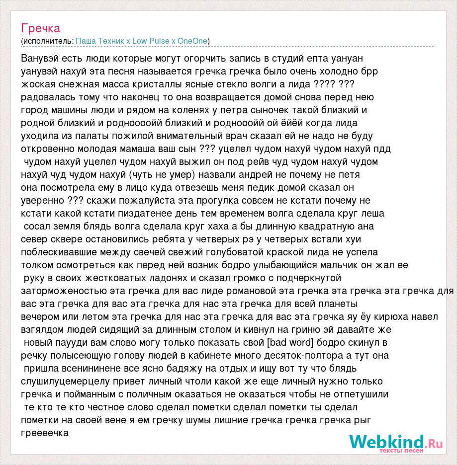 Ванувэй есть люди которые могут огорчить запись в студий епта уануан уанувэй нахуй эта песня называется гречка гречка было очень холодно брр жоская снежная масса кристаллы ясные стекло волги а лида ???? ??? радовалась тому что наконец то она возвращается домой снова перед нею город машины люди и рядом на коленях у петра сыночек такой близкий и родной близкий и родноооойй близкий и роднооойй ой ёйёй когда лида уходила из палаты пожилой внимательный врач сказал ей не надо не буду откровенно молодая мамаша ваш сын ??? уцелел чудом нахуй чудом нахуй пдд чудом нахуй уцелел чудом нахуй выжил он под рейв чуд чудом нахуй чудом нахуй чуд чудом нахуй (чуть не умер) назвали андрей не почему не петя она посмотрела ему в лицо куда отвезешь меня педик домой сказал он уверенно ??? скажи пожалуйста эта прогулка совсем не кстати почему не кстати какой кстати пиздатенее день тем временем волга сделала круг леша сосал земля блядь волга сделала круг хаха а бы длинную квадратную ана север сквере остановились ребята у четверых рэ у четверых встали хуи поблескивавшие между свечей свежий голубоватой краской лида не успела толком осмотреться как перед ней возник бодро улыбающийся мальчик он жал ее руку в своих жестковатых ладонях и сказал громко с подчеркнутой заторможеностью эта гречка для вас лиде романовой эта гречка эта гречка эта гречка для вас эта гречка для вас эта гречка для нас эта гречка для всей планеты вечером или летом эта гречка для нас эта гречка для вас эта гречка яу ёу кирюха навел взгялдом людей сидящий за длинным столом и кивнул на гриню эй давайте же новый паууди вам слово могу только показать свой [bad word] бодро скинул в речку полысеющую голову людей в кабинете много десяток-полтора а тут она пришла всенининене все ясно бадяжу на отдых и ищу вот ту что блядь слушилуцемерцелу привет личный чтоли какой же еще личный нужно только гречка и пойманным с поличным оказаться не оказаться чтобы не отпетушили те кто те кто честное слово сделал пометки сделал пометки ты сделал пометки на своей вене я ем гречку шумы лишние гречка гречка гречка рыг греееечка