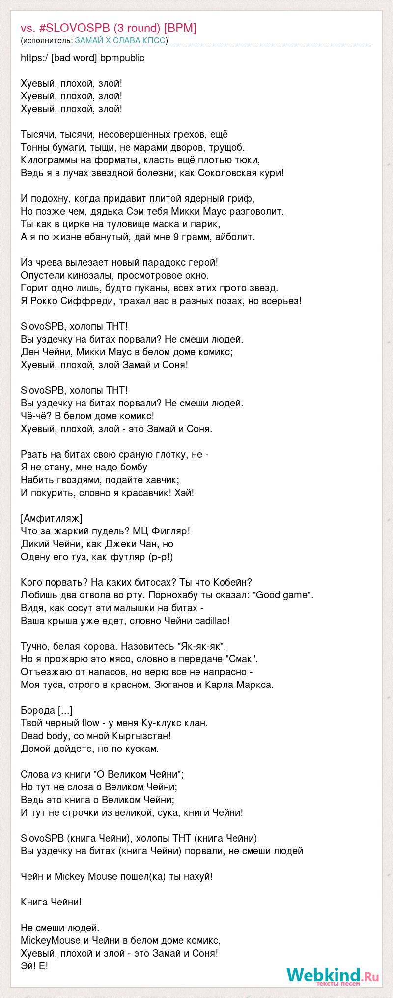 https:/ [bad word] bpmpublic Хуевый, плохой, злой! Хуевый, плохой, злой! Хуевый, плохой, злой! Тысячи, тысячи, несовершенных грехов, ещё Тонны бумаги, тыщи, не марами дворов, трущоб. Килограммы на форматы, класть ещё плотью тюки, Ведь я в лучах звездной болезни, как Соколовская кури! И подохну, когда придавит плитой ядерный гриф, Но позже чем, дядька Сэм тебя Микки Маус разговолит. Ты как в цирке на туловище маска и парик, А я по жизне ебанутый, дай мне 9 грамм, айболит. Из чрева вылезает новый парадокс герой! Опустели кинозалы, просмотровое окно. Горит одно лишь, будто пуканы, всех этих прото звезд. Я Рокко Сиффреди, трахал вас в разных позах, но всерьез! SlovoSPB, холопы ТНТ! Вы уздечку на битах порвали? Не смеши людей. Ден Чейни, Микки Маус в белом доме комикс; Хуевый, плохой, злой Замай и Соня! SlovoSPB, холопы ТНТ! Вы уздечку на битах порвали? Не смеши людей. Чё-чё? В белом доме комикс! Хуевый, плохой, злой - это Замай и Соня. Рвать на битах свою сраную глотку, не - Я не стану, мне надо бомбу Набить гвоздями, подайте хавчик; И покурить, словно я красавчик! Хэй! [Амфитиляж] Что за жаркий пудель? МЦ Фигляр! Дикий Чейни, как Джеки Чан, но Одену его туз, как футляр (р-р!) Кого порвать? На каких битосах? Ты что Кобейн? Любишь два ствола во рту. Порнохабу ты сказал: "Good game". Видя, как сосут эти малышки на битах - Ваша крыша уже едет, словно Чейни cadillac! Тучно, белая корова. Назовитесь "Як-як-як", Но я прожарю это мясо, словно в передаче "Смак". Отъезжаю от напасов, но верю все не напрасно - Моя туса, строго в красном. Зюганов и Карла Маркса. Борода [...] Твой черный flow - у меня Ку-клукс клан. Dead body, со мной Кыргызстан! Домой дойдете, но по кускам. Слова из книги "О Великом Чейни"; Но тут не слова о Великом Чейни; Ведь это книга о Великом Чейни; И тут не строчки из великой, сука, книги Чейни! SlovoSPB (книга Чейни), холопы ТНТ (книга Чейни) Вы уздечку на битах (книга Чейни) порвали, не смеши людей Чейн и Mickey Mouse пошел(ка) ты нахуй! Книга Чейни! Не смеши людей. MickeyMouse и Чейни в белом доме комикс, Хуевый, плохой и злой - это Замай и Соня! Эй! Е!