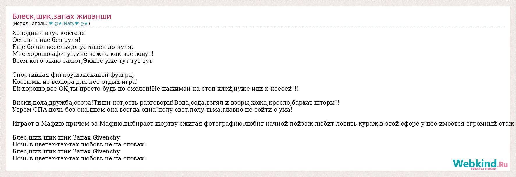 Холодный вкус коктеля Оставил нас без руля! Еще бокал веселья,опусташен до нуля, Мне хорошо афигут,мне важно как вас зовут! Всем кого знаю салют,Экжес уже тут тут тут Спортивная фигиру,изысканей фуагра, Костюмы из велюра для нее отдых-игра! Ей хорошо,все ОК,ты просто будь по смелей!Не нажимай на стоп клей,нуже иди к неееей!!! Виски,кола,дружба,ссора!Тиши нет,есть разговоры!Вода,сода,взгял и взоры,кожа,кресло,бархат шторы!! Утром СПА,ночь без сна,днем она всегда одна!полу-свет,полу-тьма,главно не сойти с ума! Играет в Мафию,причем за Мафию,выбирает жертву сжигая фотографию,любит начной пейзаж,любит ловить кураж,в этой сфере у нее имеется огромный стаж. Блес,шик шик шик Запах Givenchy Ночь в цветах-тах-тах любовь не на словах! Блес,шик шик шик Запах Givenchy Ночь в цветах-тах-тах любовь не на словах!