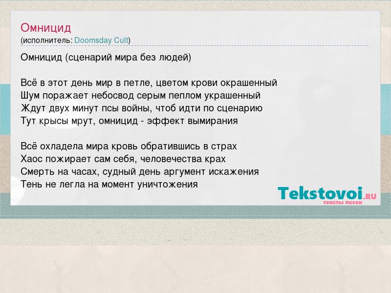 Омницид (сценарий мира без людей) Всё в этот день мир в петле, цветом крови окрашенный Шум поражает небосвод серым пеплом украшенный Ждут двух минут псы войны, чтоб идти по сценарию Тут крысы мрут, омницид - эффект вымирания Всё охладела мира кровь обратившись в страх Хаос пожирает сам себя, человечества крах Смерть на часах, судный день аргумент искажения Тень не легла на момент уничтожения