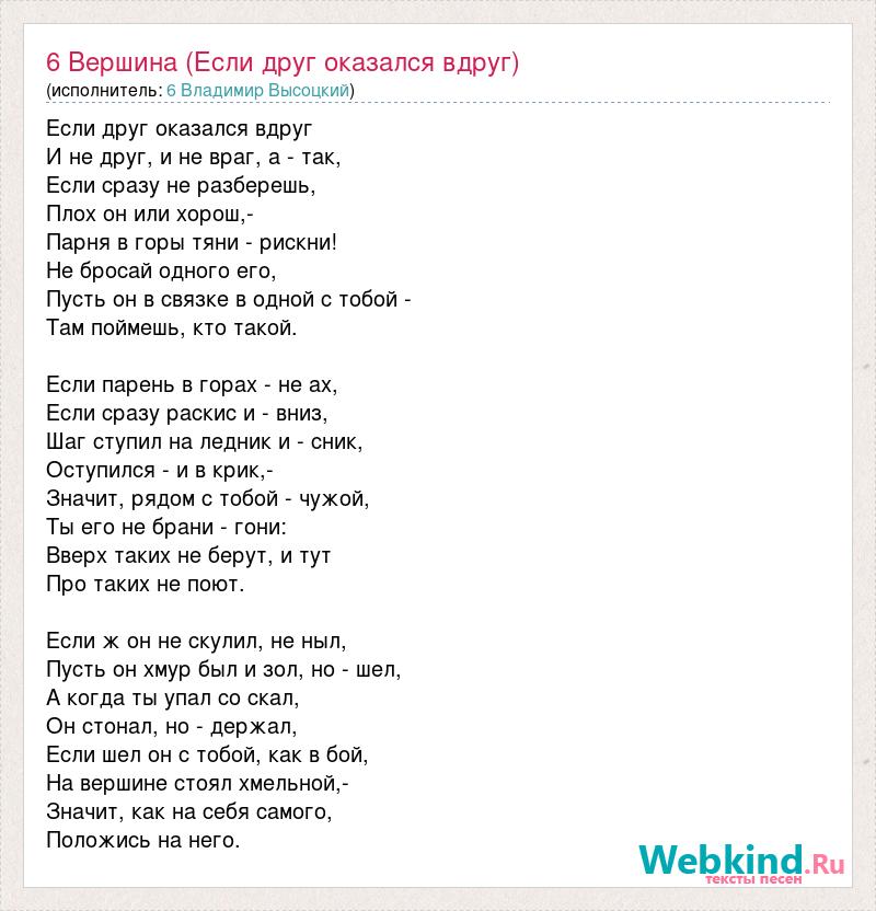 Если друг оказался вдруг И не друг, и не враг, а - так, Если сразу не разберешь, Плох он или хорош,- Парня в горы тяни - рискни! Не бросай одного его, Пусть он в связке в одной с тобой - Там поймешь, кто такой. Если парень в горах - не ах, Если сразу раскис и - вниз, Шаг ступил на ледник и - сник, Оступился - и в крик,- Значит, рядом с тобой - чужой, Ты его не брани - гони: Вверх таких не берут, и тут Про таких не поют. Если ж он не скулил, не ныл, Пусть он хмур был и зол, но - шел, А когда ты упал со скал, Он стонал, но - держал, Если шел он с тобой, как в бой, На вершине стоял хмельной,- Значит, как на себя самого, Положись на него.