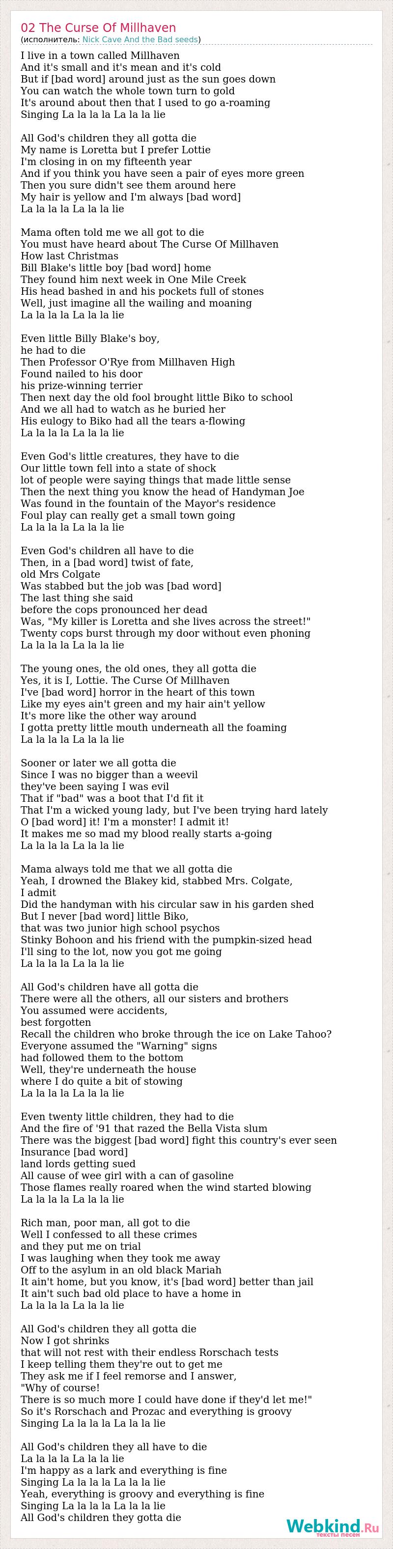 I live in a town called Millhaven And it's small and it's mean and it's cold But if [bad word] around just as the sun goes down You can watch the whole town turn to gold It's around about then that I used to go a-roaming Singing La la la la La la la lie All God's children they all gotta die My name is Loretta but I prefer Lottie I'm closing in on my fifteenth year And if you think you have seen a pair of eyes more green Then you sure didn't see them around here My hair is yellow and I'm always [bad word] La la la la La la la lie Mama often told me we all got to die You must have heard about The Curse Of Millhaven How last Christmas Bill Blake's little boy [bad word] home They found him next week in One Mile Creek His head bashed in and his pockets full of stones Well, just imagine all the wailing and moaning La la la la La la la lie Even little Billy Blake's boy, he had to die Then Professor O'Rye from Millhaven High Found nailed to his door his prize-winning terrier Then next day the old fool brought little Biko to school And we all had to watch as he buried her His eulogy to Biko had all the tears a-flowing La la la la La la la lie Even God's little creatures, they have to die Our little town fell into a state of shock lot of people were saying things that made little sense Then the next thing you know the head of Handyman Joe Was found in the fountain of the Mayor's residence Foul play can really get a small town going La la la la La la la lie Even God's children all have to die Then, in a [bad word] twist of fate, old Mrs Colgate Was stabbed but the job was [bad word] The last thing she said before the cops pronounced her dead Was, "My killer is Loretta and she lives across the street!" Twenty cops burst through my door without even phoning La la la la La la la lie The young ones, the old ones, they all gotta die Yes, it is I, Lottie. The Curse Of Millhaven I've [bad word] horror in the heart of this town Like my eyes ain't green and my hair ain't yellow It's more like the other way around I gotta pretty little mouth underneath all the foaming La la la la La la la lie Sooner or later we all gotta die Since I was no bigger than a weevil they've been saying I was evil That if "bad" was a boot that I'd fit it That I'm a wicked young lady, but I've been trying hard lately O [bad word] it! I'm a monster! I admit it! It makes me so mad my blood really starts a-going La la la la La la la lie Mama always told me that we all gotta die Yeah, I drowned the Blakey kid, stabbed Mrs. Colgate, I admit Did the handyman with his circular saw in his garden shed But I never [bad word] little Biko, that was two junior high school psychos Stinky Bohoon and his friend with the pumpkin-sized head I'll sing to the lot, now you got me going La la la la La la la lie All God's children have all gotta die There were all the others, all our sisters and brothers You assumed were accidents, best forgotten Recall the children who broke through the ice on Lake Tahoo? Everyone assumed the "Warning" signs had followed them to the bottom Well, they're underneath the house where I do quite a bit of stowing La la la la La la la lie Even twenty little children, they had to die And the fire of '91 that razed the Bella Vista slum There was the biggest [bad word] fight this country's ever seen Insurance [bad word] land lords getting sued All cause of wee girl with a can of gasoline Those flames really roared when the wind started blowing La la la la La la la lie Rich man, poor man, all got to die Well I confessed to all these crimes and they put me on trial I was laughing when they took me away Off to the asylum in an old black Mariah It ain't home, but you know, it's [bad word] better than jail It ain't such bad old place to have a home in La la la la La la la lie All God's children they all gotta die Now I got shrinks that will not rest with their endless Rorschach tests I keep telling them they're out to get me They ask me if I feel remorse and I answer, "Why of course! There is so much more I could have done if they'd let me!" So it's Rorschach and Prozac and everything is groovy Singing La la la la La la la lie All God's children they all have to die La la la la La la la lie I'm happy as a lark and everything is fine Singing La la la la La la la lie Yeah, everything is groovy and everything is fine Singing La la la la La la la lie All God's children they gotta die