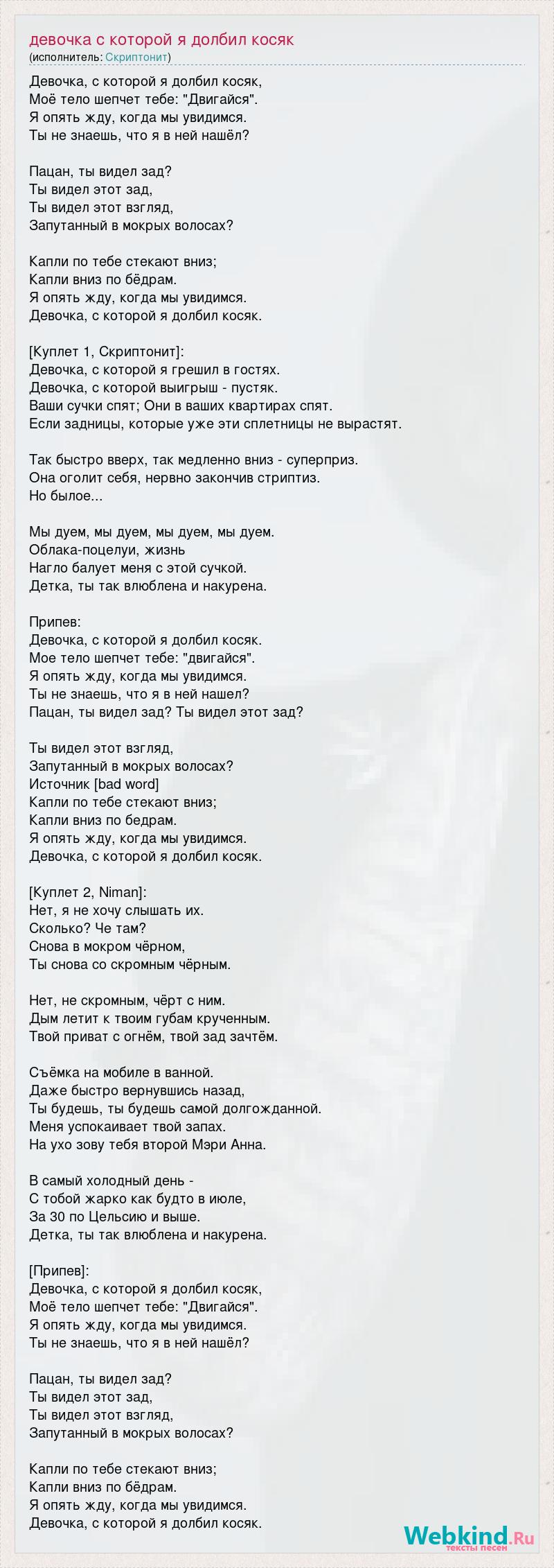 Девочка, с которой я долбил косяк, Моё тело шепчет тебе: "Двигайся". Я опять жду, когда мы увидимся. Ты не знаешь, что я в ней нашёл? Пацан, ты видел зад? Ты видел этот зад, Ты видел этот взгляд, Запутанный в мокрых волосах? Капли по тебе стекают вниз; Капли вниз по бёдрам. Я опять жду, когда мы увидимся. Девочка, с которой я долбил косяк. [Куплет 1, Скриптонит]: Девочка, с которой я грешил в гостях. Девочка, с которой выигрыш - пустяк. Ваши сучки спят; Они в ваших квартирах спят. Если задницы, которые уже эти сплетницы не вырастят. Так быстро вверх, так медленно вниз - суперприз. Она оголит себя, нервно закончив стриптиз. Но былое... Мы дуем, мы дуем, мы дуем, мы дуем. Облака-поцелуи, жизнь Нагло балует меня с этой сучкой. Детка, ты так влюблена и накурена. Припев: Девочка, с которой я долбил косяк. Мое тело шепчет тебе: "двигайся". Я опять жду, когда мы увидимся. Ты не знаешь, что я в ней нашел? Пацан, ты видел зад? Ты видел этот зад? Ты видел этот взгляд, Запутанный в мокрых волосах? Источник [bad word] Капли по тебе стекают вниз; Капли вниз по бедрам. Я опять жду, когда мы увидимся. Девочка, с которой я долбил косяк. [Куплет 2, Niman]: Нет, я не хочу слышать их. Сколько? Че там? Снова в мокром чёрном, Ты снова со скромным чёрным. Нет, не скромным, чёрт с ним. Дым летит к твоим губам крученным. Твой приват с огнём, твой зад зачтём. Съёмка на мобиле в ванной. Даже быстро вернувшись назад, Ты будешь, ты будешь самой долгожданной. Меня успокаивает твой запах. На ухо зову тебя второй Мэри Анна. В самый холодный день - С тобой жарко как будто в июле, За 30 по Цельсию и выше. Детка, ты так влюблена и накурена. [Припев]: Девочка, с которой я долбил косяк, Моё тело шепчет тебе: "Двигайся". Я опять жду, когда мы увидимся. Ты не знаешь, что я в ней нашёл? Пацан, ты видел зад? Ты видел этот зад, Ты видел этот взгляд, Запутанный в мокрых волосах? Капли по тебе стекают вниз; Капли вниз по бёдрам. Я опять жду, когда мы увидимся. Девочка, с которой я долбил косяк.
