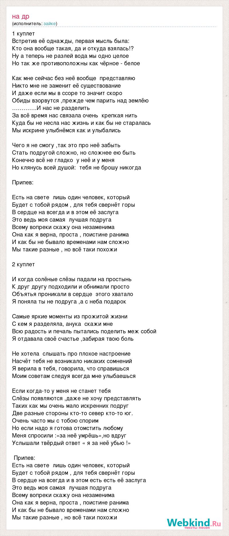1 куплет Встретив её однажды, первая мысль была: Кто она вообще такая, да и откуда взялась!? Ну а теперь не разлей вода мы одно целое Но так же противоположны как чёрное - белое Как мне сейчас без неё вообще представляю Никто мне не заменит её существование И даже если мы в ссоре то значит скоро Обиды взорвутся ,прежде чем парить над землёю ………….И нас не разделить За всё время нас связала очень крепкая нить Куда бы не несла нас жизнь и как бы не старалась Мы искрине улыбнёмся как и улыбались Чего я не смогу ,так это про неё забыть Стать подругой сложно, но сложнее ею быть Конечно всё не гладко у неё и у меня Но клянусь всей душой: тебя не брошу никогда Припев: Есть на свете лишь один человек, который Будет с тобой рядом , для тебя свернёт горы В сердце на всегда и в этом её заслуга Это ведь моя самая лучшая подруга Всему вопреки скажу она незаменима Она как я верна, проста , поистине ранима И как бы не бывало временами нам сложно Мы такие разные , но всё таки похожи 2 куплет И когда солёные слёзы падали на простынь К друг другу подходили и обнимали просто Объятья проникали в сердце этого хватало Я поняла ты не подруга ,а с неба подарок Самые яркие моменты из прожитой жизни С кем я разделяла, анука скажи мне Всю радость и печаль пытались поделить меж собой Я отдавала своё счастье ,забирая твою боль Не хотела слышать про плохое настроение Насчёт тебя не возникало никаких сомнений Я верила в тебя, говорила, что справишься Моим советам следуя всегда мне улыбаешься Если когда-то у меня не станет тебя Слёзы появляются ,даже не хочу представлять Таких как мы очень мало искренних подруг Две разные стороны кто-то север кто-то юг. Очень часто мы с тобою спорим Но если надо я готова отомстить любому Меня спросили :«за неё умрёшь»,но вдруг Услышали твёрдый ответ « я за неё убью !» Припев: Есть на свете лишь один человек, который Будет с тобой рядом , для тебя свернёт горы В сердце на всегда и в этом есть есть её заслуга Это ведь моя самая лучшая подруга Всему вопреки скажу она незаменима Она как я верна, проста , поистине ранима И как бы не бывало временами нам сложно Мы такие разные , но всё таки похожи