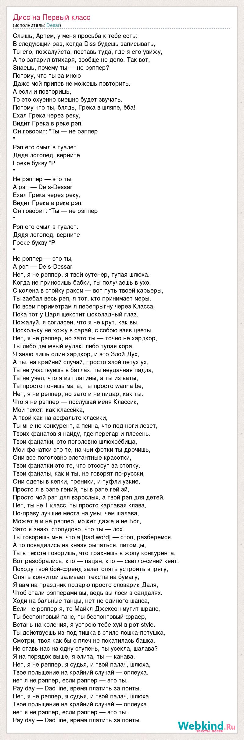 Слышь, Артем, у меня просьба к тебе есть: В следующий раз, когда Diss будешь записывать, Ты его, пожалуйста, поставь туда, где я его увижу, А то затарил втихаря, вообще не дело. Так вот, Знаешь, почему ты — не рэппер? Потому, что ты за мною Даже мой припев не можешь повторить. А если и повторишь, То это охуенно смешно будет звучать. Потому что ты, блядь, Грека в шляпе, ёба! Ехал Грека через реку, Видит Грека в реке рэп. Он говорит: "Ты — не рэппер " Рэп его смыл в туалет. Дядя логопед, верните Греке букву "Р " Не рэппер — это ты, А рэп — De s-Dessar Ехал Грека через реку, Видит Грека в реке рэп. Он говорит: "Ты — не рэппер " Рэп его смыл в туалет. Дядя логопед, верните Греке букву "Р " Не рэппер — это ты, А рэп — De s-Dessar Нет, я не рэппер, я твой сутенер, тупая шлюха. Когда не приносишь бабки, ты получаешь в ухо. С колена в стойку раком — вот путь твоей карьеры, Ты заебал весь рэп, я тот, кто принимает меры. По всем периметрам я перепрыгну через Класса, Пока тот у Царя щекотит шоколадный глаз. Пожалуй, я согласен, что я не крут, как вы, Поскольку не хожу в сарай, с собою взяв цветы. Нет, я не рэппер, но зато ты — точно не хардкор, Ты либо дешевый мудак, либо тупая кора, Я знаю лишь один хардкор, и это Злой Дух, А ты, на крайний случай, просто злой петух ух, Ты не участвуешь в батлах, ты неудачная падла, Ты не учел, что я из платины, а ты из ваты, Ты просто гонишь маты, ты просто wanna be, Нет, я не рэппер, но зато и не пидар, как ты. Что я не рэппер — послушай меня Классик, Мой текст, как классика, А твой как на асфальте класики, Ты мне не конкурент, а псина, что под ноги лезет, Твоих фанатов я найду, где перегар и плесень. Твои фанатки, это поголовно шлюхоёбища, Мои фанатки это те, на чьи фотки ты дрочишь, Они все поголовно элегантные красотки, Твои фанатки это те, что отсосут за стопку. Твои фанаты, как и ты, не говорят по-русски, Они одеты в кепки, треники, и туфли узкие, Просто я в рэпе гений, ты в рэпе гей эй, Просто мой рэп для взрослых, а твой рэп для детей. Нет, ты не 1 класс, ты просто картавая клава, По-праву лучшие места на умы, чем шалава, Может я и не рэппер, может даже и не Бог, Зато я знаю, стопудово, что ты — лох. Ты говоришь мне, что я [bad word] — стоп, разберемся, А то повадились на князя рыпаться, питомцы, Ты в тексте говоришь, что трахнешь в жопу конкурента, Вот разобрались, кто — пацан, кто — светло-синий кент. Походу твой бой-френд залег опять устроить впрягу, Опять кончитой заливает тексты на бумагу, Я вам на праздник подарю просто словарик Даля, Чтоб стали рэпперами вы, ведь вы лоси в сандалях. Ходи на бальные танцы, нет не единого шанса, Если не рэппер я, то Майкл Джексон мутит шранс, Ты беспонтовый ганс, ты беспонтовый фраер, Встань на коления, я устрою тебе хуй в рот style. Ты действуешь из-под тишка в стиле лошка-петушка, Смотри, твоя как бы с плеч не покатилась башка. Не ставь нас на одну ступень, ты усекла, шалава? Я на порядок выше, я элита, ты — канава. Нет, я не рэппер, я судья, и твой палач, шлюха, Твое польщение на крайний случай — оплеуха. нет я не рэппер, если рэппер — это ты. Pay day — Dad line, время платить за понты. Нет, я не рэппер, я судья, и твой палач, шлюха, Твое польщение на крайний случай — оплеуха. нет я не рэппер, если рэппер — это ты. Pay day — Dad line, время платить за понты.