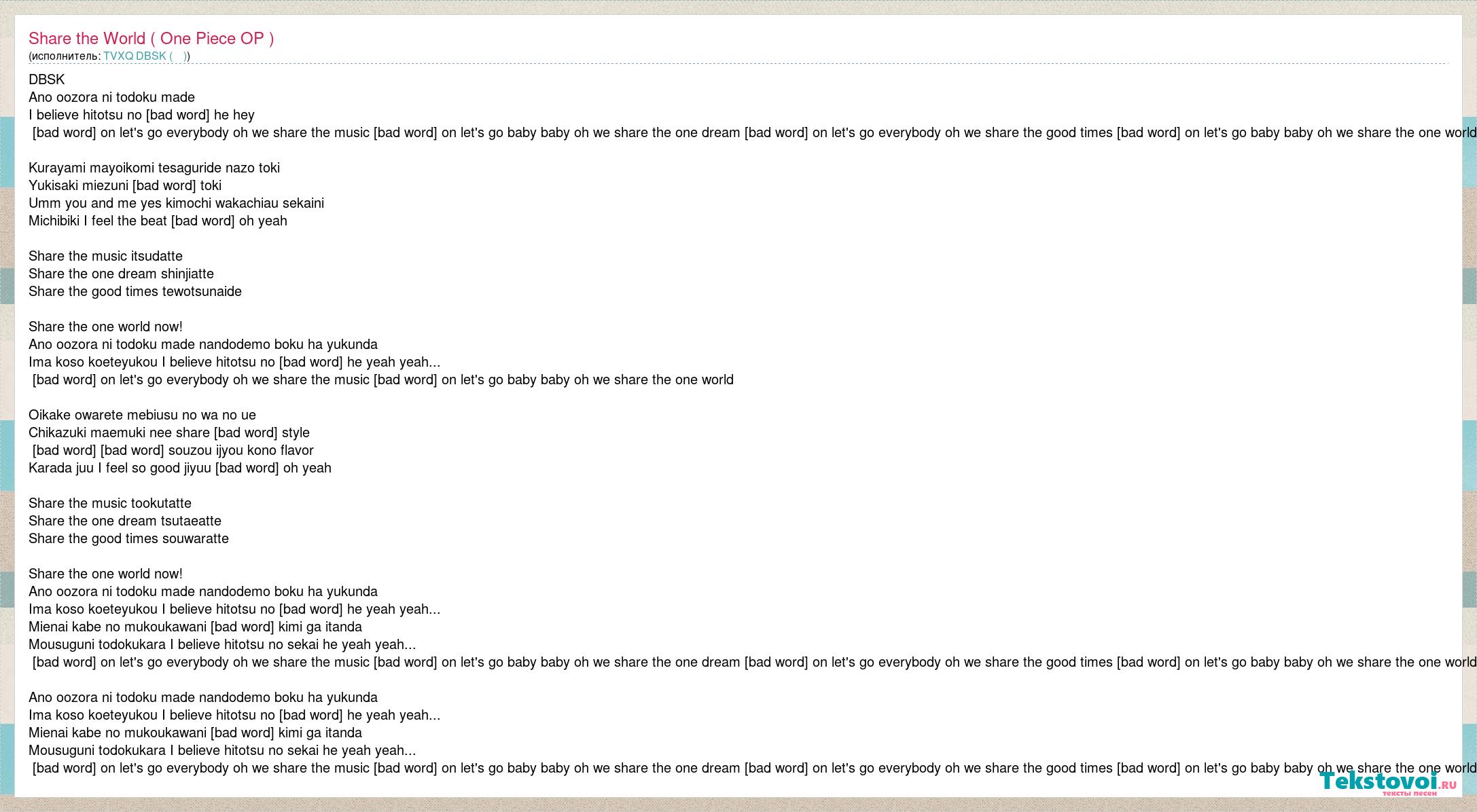 А как ты думаешь, о чем песня "Share the World ( One Piece OP )" ?