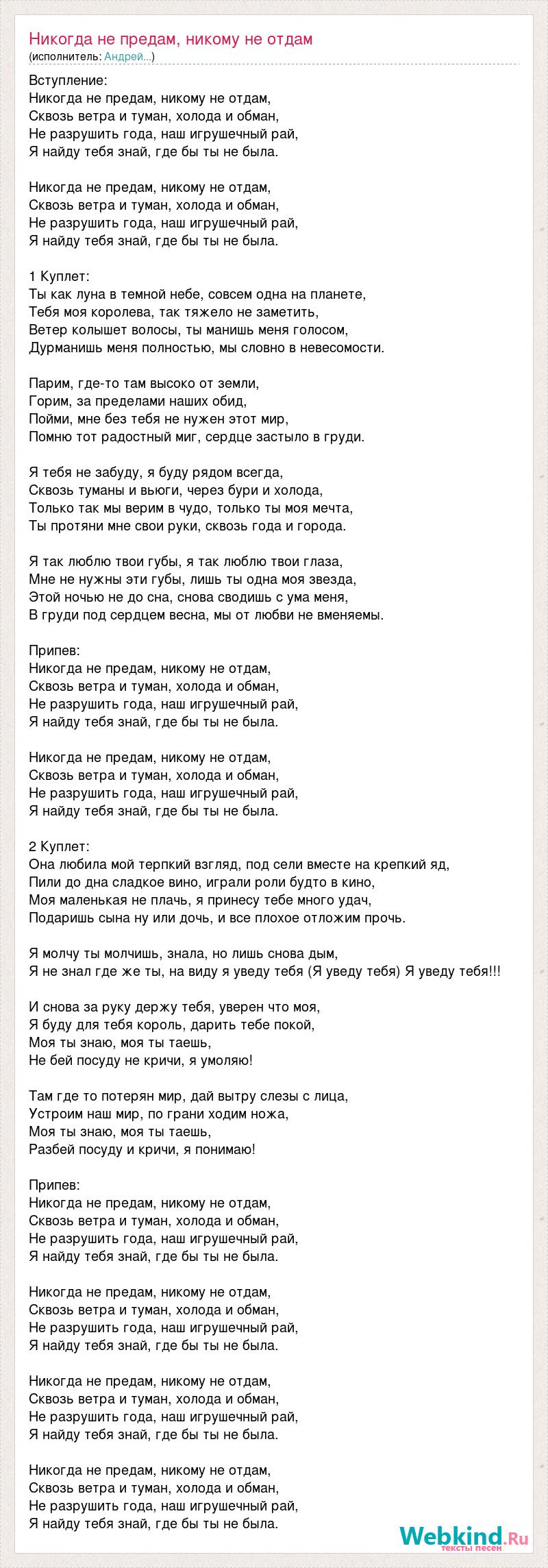Вступление: Никогда не предам, никому не отдам, Сквозь ветра и туман, холода и обман, Не разрушить года, наш игрушечный рай, Я найду тебя знай, где бы ты не была. Никогда не предам, никому не отдам, Сквозь ветра и туман, холода и обман, Не разрушить года, наш игрушечный рай, Я найду тебя знай, где бы ты не была. 1 Куплет: Ты как луна в темной небе, совсем одна на планете, Тебя моя королева, так тяжело не заметить, Ветер колышет волосы, ты манишь меня голосом, Дурманишь меня полностью, мы словно в невесомости. Парим, где-то там высоко от земли, Горим, за пределами наших обид, Пойми, мне без тебя не нужен этот мир, Помню тот радостный миг, сердце застыло в груди. Я тебя не забуду, я буду рядом всегда, Сквозь туманы и вьюги, через бури и холода, Только так мы верим в чудо, только ты моя мечта, Ты протяни мне свои руки, сквозь года и города. Я так люблю твои губы, я так люблю твои глаза, Мне не нужны эти губы, лишь ты одна моя звезда, Этой ночью не до сна, снова сводишь с ума меня, В груди под сердцем весна, мы от любви не вменяемы. Припев: Никогда не предам, никому не отдам, Сквозь ветра и туман, холода и обман, Не разрушить года, наш игрушечный рай, Я найду тебя знай, где бы ты не была. Никогда не предам, никому не отдам, Сквозь ветра и туман, холода и обман, Не разрушить года, наш игрушечный рай, Я найду тебя знай, где бы ты не была. 2 Куплет: Она любила мой терпкий взгляд, под сели вместе на крепкий яд, Пили до дна сладкое вино, играли роли будто в кино, Моя маленькая не плачь, я принесу тебе много удач, Подаришь сына ну или дочь, и все плохое отложим прочь. Я молчу ты молчишь, знала, но лишь снова дым, Я не знал где же ты, на виду я уведу тебя (Я уведу тебя) Я уведу тебя!!! И снова за руку держу тебя, уверен что моя, Я буду для тебя король, дарить тебе покой, Моя ты знаю, моя ты таешь, Не бей посуду не кричи, я умоляю! Там где то потерян мир, дай вытру слезы с лица, Устроим наш мир, по грани ходим ножа, Моя ты знаю, моя ты таешь, Разбей посуду и кричи, я понимаю! Припев: Никогда не предам, никому не отдам, Сквозь ветра и туман, холода и обман, Не разрушить года, наш игрушечный рай, Я найду тебя знай, где бы ты не была. Никогда не предам, никому не отдам, Сквозь ветра и туман, холода и обман, Не разрушить года, наш игрушечный рай, Я найду тебя знай, где бы ты не была. Никогда не предам, никому не отдам, Сквозь ветра и туман, холода и обман, Не разрушить года, наш игрушечный рай, Я найду тебя знай, где бы ты не была. Никогда не предам, никому не отдам, Сквозь ветра и туман, холода и обман, Не разрушить года, наш игрушечный рай, Я найду тебя знай, где бы ты не была.