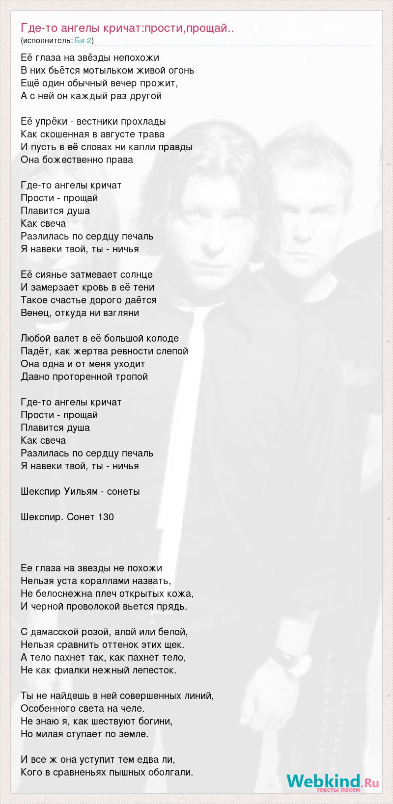 Её глаза на звёзды непохожи В них бьётся мотыльком живой огонь Ещё один обычный вечер прожит, А с ней он каждый раз другой Её упрёки - вестники прохлады Как скошенная в августе трава И пусть в её словах ни капли правды Она божественно права Где-то ангелы кричат Прости - прощай Плавится душа Как свеча Разлилась по сердцу печаль Я навеки твой, ты - ничья Её сиянье затмевает солнце И замерзает кровь в её тени Такое счастье дорого даётся Венец, откуда ни взгляни Любой валет в её большой колоде Падёт, как жертва ревности слепой Она одна и от меня уходит Давно проторенной тропой Где-то ангелы кричат Прости - прощай Плавится душа Как свеча Разлилась по сердцу печаль Я навеки твой, ты - ничья Шекспир Уильям - сонеты Шекспир. Сонет 130 Ее глаза на звезды не похожи Нельзя уста кораллами назвать, Не белоснежна плеч открытых кожа, И черной проволокой вьется прядь. С дамасской розой, алой или белой, Нельзя сравнить оттенок этих щек. А тело пахнет так, как пахнет тело, Не как фиалки нежный лепесток. Ты не найдешь в ней совершенных линий, Особенного света на челе. Не знаю я, как шествуют богини, Но милая ступает по земле. И все ж она уступит тем едва ли, Кого в сравненьях пышных оболгали.