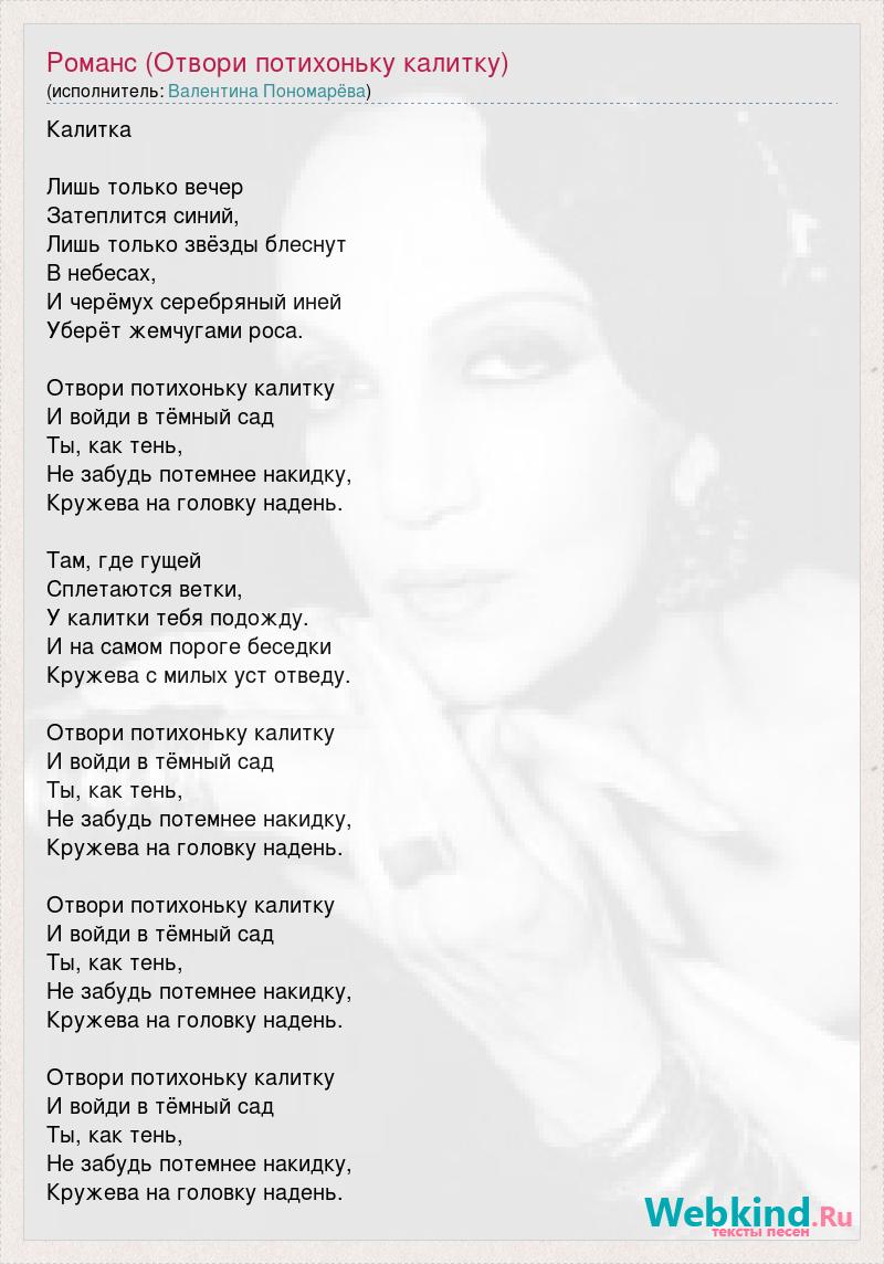 Калитка Лишь только вечер Затеплится синий, Лишь только звёзды блеснут В небесах, И черёмух серебряный иней Уберёт жемчугами роса. Отвори потихоньку калитку И войди в тёмный сад Ты, как тень, Не забудь потемнее накидку, Кружева на головку надень. Там, где гущей Сплетаются ветки, У калитки тебя подожду. И на самом пороге беседки Кружева с милых уст отведу. Отвори потихоньку калитку И войди в тёмный сад Ты, как тень, Не забудь потемнее накидку, Кружева на головку надень. Отвори потихоньку калитку И войди в тёмный сад Ты, как тень, Не забудь потемнее накидку, Кружева на головку надень. Отвори потихоньку калитку И войди в тёмный сад Ты, как тень, Не забудь потемнее накидку, Кружева на головку надень.