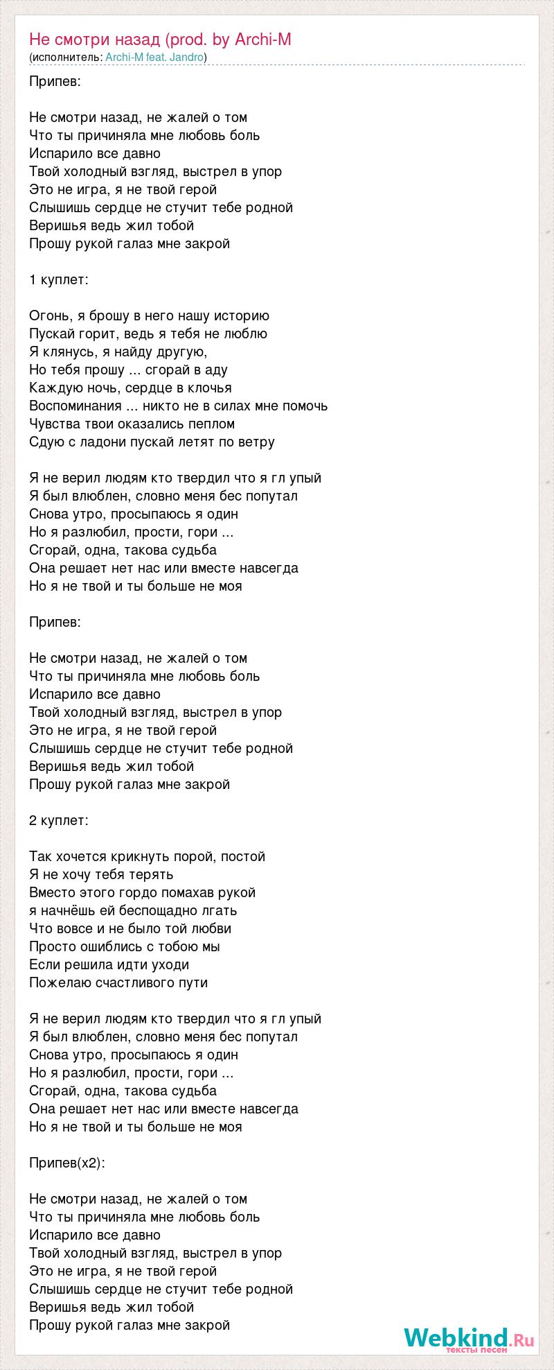 Припев: Не смотри назад, не жалей о том Что ты причиняла мне любовь боль Испарило все давно Твой холодный взгляд, выстрел в упор Это не игра, я не твой герой Слышишь сердце не стучит тебе родной Веришья ведь жил тобой Прошу рукой галаз мне закрой 1 куплет: Огонь, я брошу в него нашу историю Пускай горит, ведь я тебя не люблю Я клянусь, я найду другую, Но тебя прошу ... сгорай в аду Каждую ночь, сердце в клочья Воспоминания ... никто не в силах мне помочь Чувства твои оказались пеплом Сдую с ладони пускай летят по ветру Я не верил людям кто твердил что я гл упый Я был влюблен, словно меня бес попутал Снова утро, просыпаюсь я один Но я разлюбил, прости, гори ... Сгорай, одна, такова судьба Она решает нет нас или вместе навсегда Но я не твой и ты больше не моя Припев: Не смотри назад, не жалей о том Что ты причиняла мне любовь боль Испарило все давно Твой холодный взгляд, выстрел в упор Это не игра, я не твой герой Слышишь сердце не стучит тебе родной Веришья ведь жил тобой Прошу рукой галаз мне закрой 2 куплет: Так хочется крикнуть порой, постой Я не хочу тебя терять Вместо этого гордо помахав рукой я начнёшь ей беспощадно лгать Что вовсе и не было той любви Просто ошиблись с тобою мы Если решила идти уходи Пожелаю счастливого пути Я не верил людям кто твердил что я гл упый Я был влюблен, словно меня бес попутал Снова утро, просыпаюсь я один Но я разлюбил, прости, гори ... Сгорай, одна, такова судьба Она решает нет нас или вместе навсегда Но я не твой и ты больше не моя Припев(x2): Не смотри назад, не жалей о том Что ты причиняла мне любовь боль Испарило все давно Твой холодный взгляд, выстрел в упор Это не игра, я не твой герой Слышишь сердце не стучит тебе родной Веришья ведь жил тобой Прошу рукой галаз мне закрой