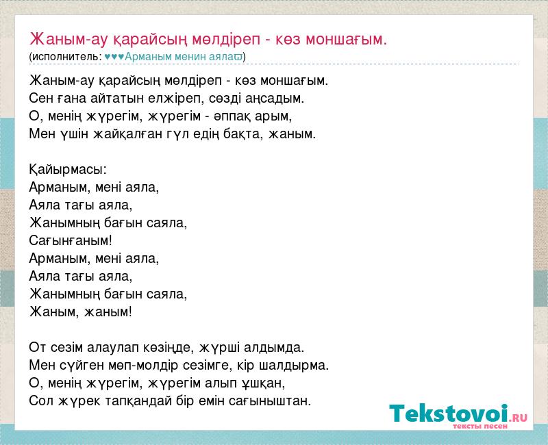Жаным-ау қарайсың мөлдіреп - көз моншағым. Сен ғана айтатын елжіреп, сөзді аңсадым. О, менің жүрегім, жүрегім - әппақ арым, Мен үшін жайқалған гүл едің бақта, жаным. Қайырмасы: Арманым, мені аяла, Аяла тағы аяла, Жанымның бағын саяла, Сағынғаным! Арманым, мені аяла, Аяла тағы аяла, Жанымның бағын саяла, Жаным, жаным! От сезім алаулап көзіңде, жүрші алдымда. Мен сүйген мөп-молдір сезімге, кір шалдырма. О, менің жүрегім, жүрегім алып ұшқан, Сол жүрек тапқандай бір емін сағыныштан.