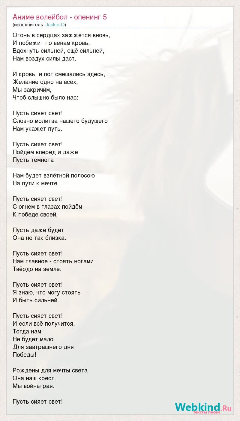 Огонь в сердцах зажжётся вновь, И побежит по венам кровь. Вдохнуть сильней, ещё сильней, Нам воздух силы даст. И кровь, и пот смешались здесь, Желание одно на всех, Мы закричим, Чтоб слышно было нас: Пусть сияет свет! Словно молитва нашего будущего Нам укажет путь. Пусть сияет свет! Пойдём вперед и даже Пусть темнота Нам будет взлётной полосою На пути к мечте. Пусть сияет свет! С огнем в глазах пойдём К победе своей, Пусть даже будет Она не так близка. Пусть сияет свет! Нам главное - стоять ногами Твёрдо на земле. Пусть сияет свет! Я знаю, что могу стоять И быть сильней. Пусть сияет свет! И если всё получится, Тогда нам Не будет мало Для завтрашнего дня Победы! Рождены для мечты света Она наш крест. Мы войны рая. Пусть сияет свет!
