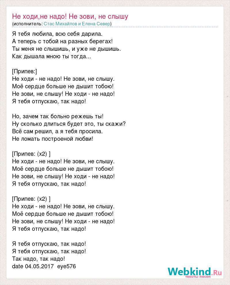 Я тебя любила, всю себя дарила. А теперь с тобой на разных берегах! Ты меня не слышишь, и уже не дышишь. Как дышала мною ты тогда... [Припев:] Не ходи - не надо! Не зови, не слышу. Моё сердце больше не дышит тобою! Не зови, не слышу! Не ходи - не надо! Я тебя отпускаю, так надо! Но, зачем так больно режешь ты! Ну сколько длиться будет это, ты скажи? Всё сам решил, а я тебя просила. Не ломать построеной любви! [Припев: (х2) ] Не ходи - не надо! Не зови, не слышу. Моё сердце больше не дышит тобою! Не зови, не слышу! Не ходи - не надо! Я тебя отпускаю, так надо! [Припев: (х2) ] Не ходи - не надо! Не зови, не слышу. Моё сердце больше не дышит тобою! Не зови, не слышу! Не ходи - не надо! Я тебя отпускаю, так надо! Я тебя отпускаю, так надо! Я тебя отпускаю, так надо! Так надо, так надо! date 04.05.2017 eye576