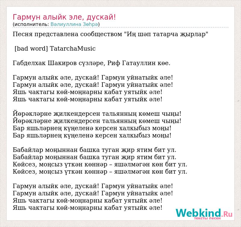 Песня представлена сообществом "Иң шәп татарча җырлар" [bad word] TatarchaMusic Габделхак Шакиров сүзләре, Риф Гатауллин көе. Гармун алыйк әле, дускай! Гармун уйнатыйк әле! Гармун алыйк әле, дускай! Гармун уйнатыйк әле! Яшь чактагы көй-моңнарны кабат уятыйк әле! Яшь чактагы көй-моңнарны кабат уятыйк әле! Йөрәкләрне җилкендерсен тальянның көмеш чыңы! Йөрәкләрне җилкендерсен тальянның көмеш чыңы! Бар яшьләрнең күңеленә керсен халкыбыз моңы! Бар яшьләрнең күңеленә керсен халкыбыз моңы! Бабайлар моңыннан башка туган җир ятим бит ул. Бабайлар моңыннан башка туган җир ятим бит ул. Көйсез, моңсыз үткән көннәр – яшәлмәгән көн бит ул. Көйсез, моңсыз үткән көннәр – яшәлмәгән көн бит ул. Гармун алыйк әле, дускай! Гармун уйнатыйк әле! Гармун алыйк әле, дускай! Гармун уйнатыйк әле! Яшь чактагы көй-моңнарны кабат уятыйк әле! Яшь чактагы көй-моңнарны кабат уятыйк әле!