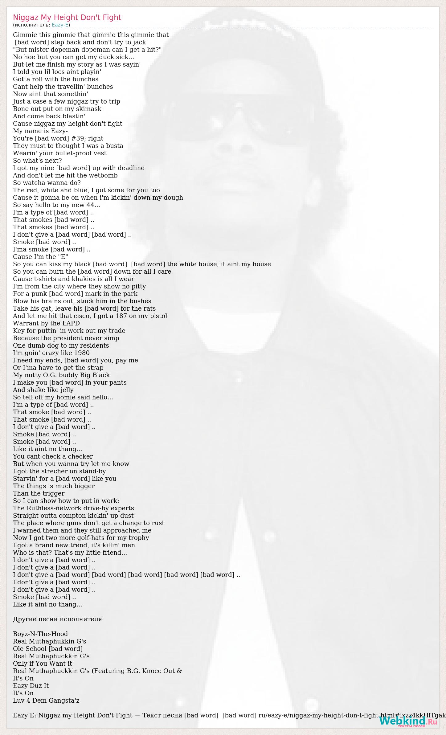 Gimmie this gimmie that gimmie this gimmie that [bad word] step back and don't try to jack "But mister dopeman dopeman can I get a hit?" No hoe but you can get my duck sick... But let me finish my story as I was sayin' I told you lil locs aint playin' Gotta roll with the bunches Cant help the travellin' bunches Now aint that somethin' Just a case a few niggaz try to trip Bone out put on my skimask And come back blastin' Cause niggaz my height don't fight My name is Eazy- You're [bad word] #39; right They must to thought I was a busta Wearin' your bullet-proof vest So what's next? I got my nine [bad word] up with deadline And don't let me hit the wetbomb So watcha wanna do? The red, white and blue, I got some for you too Cause it gonna be on when i'm kickin' down my dough So say hello to my new 44... I'm a type of [bad word] .. That smokes [bad word] .. That smokes [bad word] .. I don't give a [bad word] [bad word] .. Smoke [bad word] .. I'ma smoke [bad word] .. Cause I'm the "E" So you can kiss my black [bad word] [bad word] the white house, it aint my house So you can burn the [bad word] down for all I care Cause t-shirts and khakies is all I wear I'm from the city where they show no pitty For a punk [bad word] mark in the park Blow his brains out, stuck him in the bushes Take his gat, leave his [bad word] for the rats And let me hit that cisco, I got a 187 on my pistol Warrant by the LAPD Key for puttin' in work out my trade Because the president never simp One dumb dog to my residents I'm goin' crazy like 1980 I need my ends, [bad word] you, pay me Or I'ma have to get the strap My nutty O.G. buddy Big Black I make you [bad word] in your pants And shake like jelly So tell off my homie said hello... I'm a type of [bad word] .. That smoke [bad word] .. That smoke [bad word] .. I don't give a [bad word] .. Smoke [bad word] .. Smoke [bad word] .. Like it aint no thang... You cant check a checker But when you wanna try let me know I got the strecher on stand-by Starvin' for a [bad word] like you The things is much bigger Than the trigger So I can show how to put in work: The Ruthless-network drive-by experts Straight outta compton kickin' up dust The place where guns don't get a change to rust I warned them and they still approached me Now I got two more golf-hats for my trophy I got a brand new trend, it's killin' men Who is that? That's my little friend... I don't give a [bad word] .. I don't give a [bad word] .. I don't give a [bad word] [bad word] [bad word] [bad word] [bad word] .. I don't give a [bad word] .. I don't give a [bad word] .. Smoke [bad word] .. Like it aint no thang... Другие песни исполнителя Boyz-N-The-Hood Real Muthaphukkin G's Ole School [bad word] Real Muthaphuckkin G's Only if You Want it Real Muthaphuckkin G's (Featuring B.G. Knocc Out & It's On Eazy Duz It It's On Luv 4 Dem Gangsta'z Eazy E: Niggaz my Height Don't Fight — Текст песни [bad word] [bad word] ru/eazy-e/niggaz-my-height-don-t-fight.html#ixzz4kkHlTgak