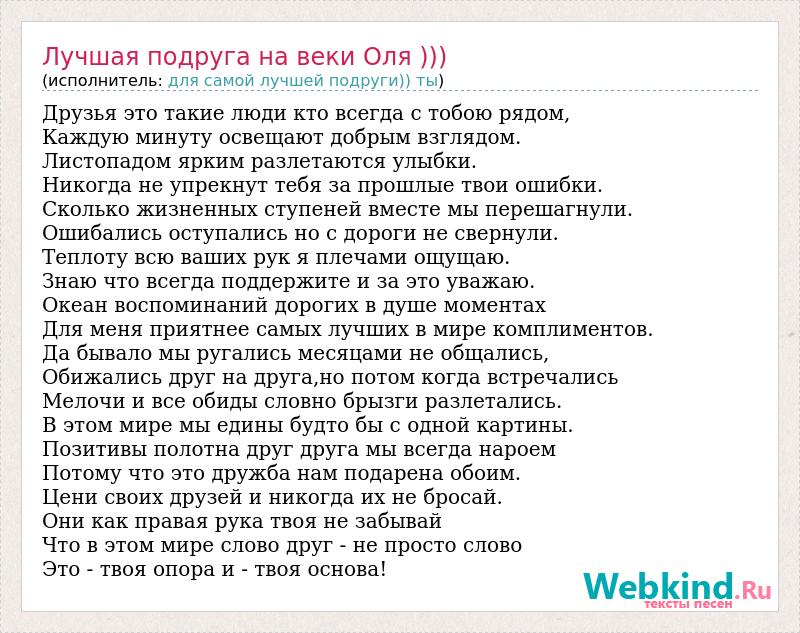 А как ты думаешь, о чем песня "Лучшая подруга на веки Оля )))" ?