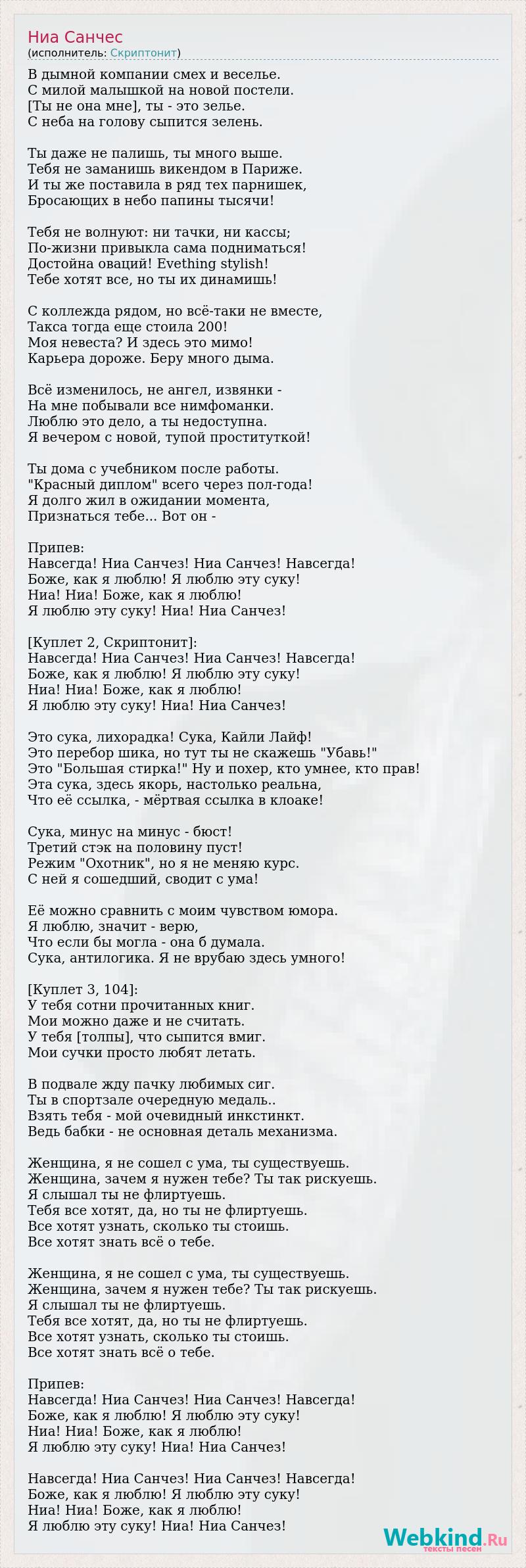 В дымной компании смех и веселье. С милой малышкой на новой постели. [Ты не она мне], ты - это зелье. С неба на голову сыпится зелень. Ты даже не палишь, ты много выше. Тебя не заманишь викендом в Париже. И ты же поставила в ряд тех парнишек, Бросающих в небо папины тысячи! Тебя не волнуют: ни тачки, ни кассы; По-жизни привыкла сама подниматься! Достойна оваций! Evething stylish! Тебе хотят все, но ты их динамишь! С коллежда рядом, но всё-таки не вместе, Такса тогда еще стоила 200! Моя невеста? И здесь это мимо! Карьера дороже. Беру много дыма. Всё изменилось, не ангел, извянки - На мне побывали все нимфоманки. Люблю это дело, а ты недоступна. Я вечером с новой, тупой проституткой! Ты дома с учебником после работы. "Красный диплом" всего через пол-года! Я долго жил в ожидании момента, Признаться тебе... Вот он - Припев: Навсегда! Ниа Санчез! Ниа Санчез! Навсегда! Боже, как я люблю! Я люблю эту суку! Ниа! Ниа! Боже, как я люблю! Я люблю эту суку! Ниа! Ниа Санчез! [Куплет 2, Скриптонит]: Навсегда! Ниа Санчез! Ниа Санчез! Навсегда! Боже, как я люблю! Я люблю эту суку! Ниа! Ниа! Боже, как я люблю! Я люблю эту суку! Ниа! Ниа Санчез! Это сука, лихорадка! Сука, Кайли Лайф! Это перебор шика, но тут ты не скажешь "Убавь!" Это "Большая стирка!" Ну и похер, кто умнее, кто прав! Эта сука, здесь якорь, настолько реальна, Что её ссылка, - мёртвая ссылка в клоаке! Сука, минус на минус - бюст! Третий стэк на половину пуст! Режим "Охотник", но я не меняю курс. С ней я сошедший, сводит с ума! Её можно сравнить с моим чувством юмора. Я люблю, значит - верю, Что если бы могла - она б думала. Сука, антилогика. Я не врубаю здесь умного! [Куплет 3, 104]: У тебя сотни прочитанных книг. Мои можно даже и не считать. У тебя [толпы], что сыпится вмиг. Мои сучки просто любят летать. В подвале жду пачку любимых сиг. Ты в спортзале очередную медаль.. Взять тебя - мой очевидный инкстинкт. Ведь бабки - не основная деталь механизма. Женщина, я не сошел с ума, ты существуешь. Женщина, зачем я нужен тебе? Ты так рискуешь. Я слышал ты не флиртуешь. Тебя все хотят, да, но ты не флиртуешь. Все хотят узнать, сколько ты стоишь. Все хотят знать всё о тебе. Женщина, я не сошел с ума, ты существуешь. Женщина, зачем я нужен тебе? Ты так рискуешь. Я слышал ты не флиртуешь. Тебя все хотят, да, но ты не флиртуешь. Все хотят узнать, сколько ты стоишь. Все хотят знать всё о тебе. Припев: Навсегда! Ниа Санчез! Ниа Санчез! Навсегда! Боже, как я люблю! Я люблю эту суку! Ниа! Ниа! Боже, как я люблю! Я люблю эту суку! Ниа! Ниа Санчез! Навсегда! Ниа Санчез! Ниа Санчез! Навсегда! Боже, как я люблю! Я люблю эту суку! Ниа! Ниа! Боже, как я люблю! Я люблю эту суку! Ниа! Ниа Санчез!