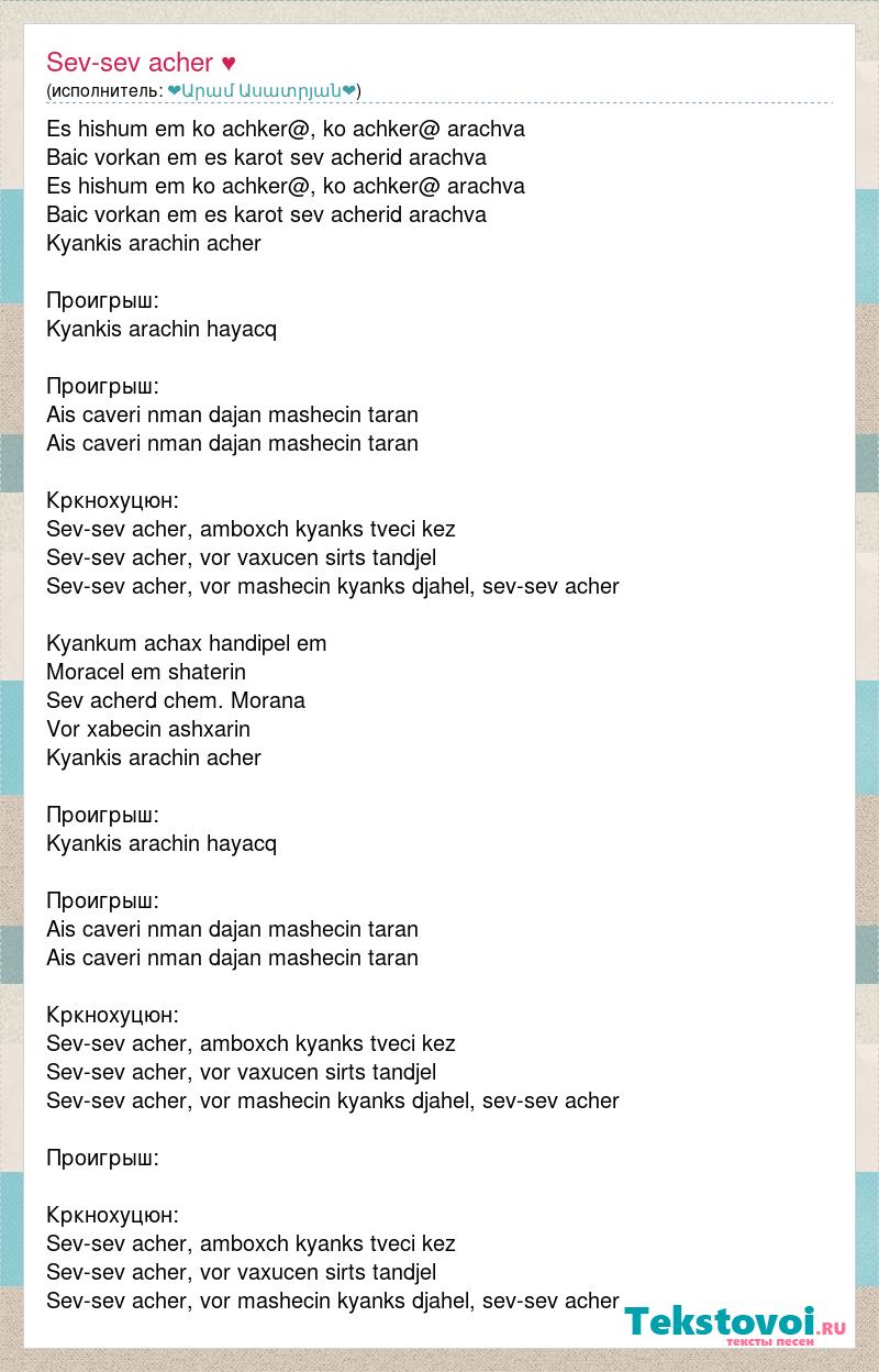 Es hishum em ko achker@, ko achker@ arachva Baic vorkan em es karot sev acherid arachva Es hishum em ko achker@, ko achker@ arachva Baic vorkan em es karot sev acherid arachva Kyankis arachin acher Проигрыш: Kyankis arachin hayacq Проигрыш: Ais caveri nman dajan mashecin taran Ais caveri nman dajan mashecin taran Кркнохуцюн: Sev-sev acher, amboxch kyanks tveci kez Sev-sev acher, vor vaxucen sirts tandjel Sev-sev acher, vor mashecin kyanks djahel, sev-sev acher Kyankum achax handipel em Moracel em shaterin Sev acherd chem. Morana Vor xabecin ashxarin Kyankis arachin acher Проигрыш: Kyankis arachin hayacq Проигрыш: Ais caveri nman dajan mashecin taran Ais caveri nman dajan mashecin taran Кркнохуцюн: Sev-sev acher, amboxch kyanks tveci kez Sev-sev acher, vor vaxucen sirts tandjel Sev-sev acher, vor mashecin kyanks djahel, sev-sev acher Проигрыш: Кркнохуцюн: Sev-sev acher, amboxch kyanks tveci kez Sev-sev acher, vor vaxucen sirts tandjel Sev-sev acher, vor mashecin kyanks djahel, sev-sev acher