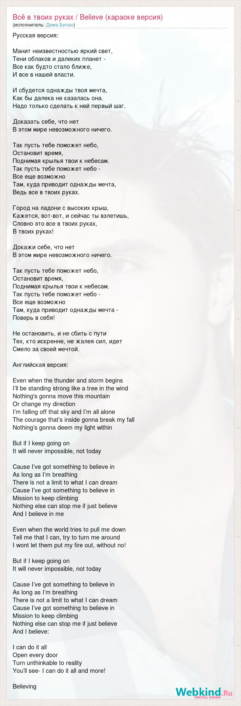 Русская версия: Манит неизвестностью яркий свет, Тени облаков и далеких планет - Все как будто стало ближе, И все в нашей власти. И сбудется однажды твоя мечта, Как бы далека не казалась она. Надо только сделать к ней первый шаг. Доказать себе, что нет В этом мире невозможного ничего. Так пусть тебе поможет небо, Остановит время, Поднимая крылья твои к небесам. Так пусть тебе поможет небо - Все еще возможно Там, куда приводит однажды мечта, Ведь все в твоих руках. Город на ладони с высоких крыш, Кажется, вот-вот, и сейчас ты взлетишь, Словно это все в твоих руках, В твоих руках! Докажи себе, что нет В этом мире невозможного ничего. Так пусть тебе поможет небо, Остановит время, Поднимая крылья твои к небесам. Так пусть тебе поможет небо - Все еще возможно Там, куда приводит однажды мечта - Поверь в себя! Не остановить, и не сбить с пути Тех, кто искренне, не жалея сил, идет Смело за своей мечтой. Английская версия: Even when the thunder and storm begins I’ll be standing strong like a tree in the wind Nothing's gonna move this mountain Or change my direction I’m falling off that sky and I’m all alone The courage that’s inside gonna break my fall Nothing’s gonna deem my light within But if I keep going on It will never impossible, not today Cause I’ve got something to believe in As long as I’m breathing There is not a limit to what I can dream Cause I’ve got something to believe in Mission to keep climbing Nothing else can stop me if just believe And I believe in me Even when the world tries to pull me down Tell me that I can, try to turn me around I wont let them put my fire out, without no! But if I keep going on It will never impossible, not today Cause I’ve got something to believe in As long as I’m breathing There is not a limit to what I can dream Cause I’ve got something to believe in Mission to keep climbing Nothing else can stop me if just believe And I believe: I can do it all Open every door Turn unthinkable to reality You’ll see- I can do it all and more! Believing
