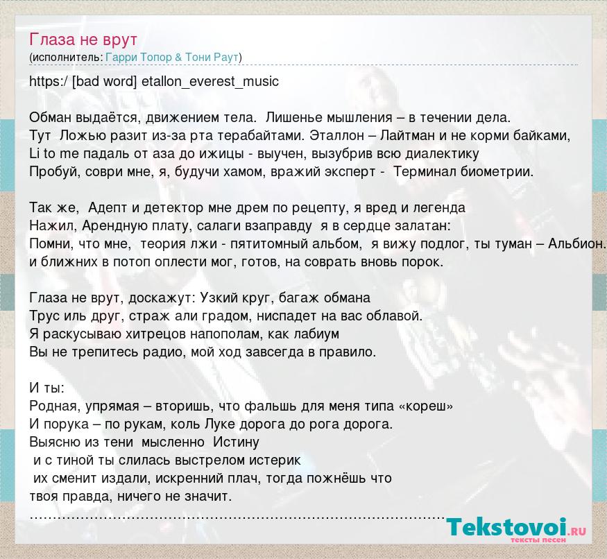 https:/ [bad word] etallon_everest_music Обман выдаётся, движением тела. Лишенье мышления – в течении дела. Тут Ложью разит из-за рта терабайтами. Эталлон – Лайтман и не корми байками, Li to me падаль от аза до ижицы - выучен, вызубрив всю диалектику Пробуй, соври мне, я, будучи хамом, вражий эксперт - Терминал биометрии. Так же, Адепт и детектор мне дрем по рецепту, я вред и легенда Нажил, Арендную плату, салаги взаправду я в сердце залатан: Помни, что мне, теория лжи - пятитомный альбом, я вижу подлог, ты туман – Альбион. и ближних в потоп оплести мог, готов, на соврать вновь порок. Глаза не врут, доскажут: Узкий круг, багаж обмана Трус иль друг, страж али градом, ниспадет на вас облавой. Я раскусываю хитрецов напополам, как лабиум Вы не трепитесь радио, мой ход завсегда в правило. И ты: Родная, упрямая – вторишь, что фальшь для меня типа «кореш» И порука – по рукам, коль Луке дорога до рога дорога. Выясню из тени мысленно Истину и с тиной ты слилась выстрелом истерик их сменит издали, искренний плач, тогда пожнёшь что твоя правда, ничего не значит. ………………………………………………………………………………