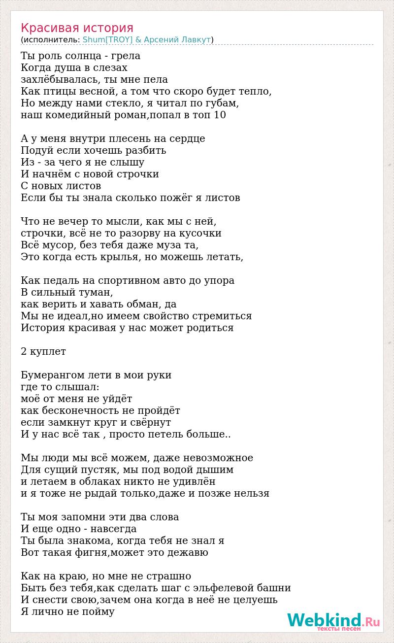 Ты роль солнца - грела Когда душа в слезах захлёбывалась, ты мне пела Как птицы весной, а том что скоро будет тепло, Но между нами стекло, я читал по губам, наш комедийный роман,попал в топ 10 А у меня внутри плесень на сердце Подуй если хочешь разбить Из - за чего я не слышу И начнём с новой строчки С новых листов Если бы ты знала сколько пожёг я листов Что не вечер то мысли, как мы с ней, строчки, всё не то разорву на кусочки Всё мусор, без тебя даже муза та, Это когда есть крылья, но можешь летать, Как педаль на спортивном авто до упора В сильный туман, как верить и хавать обман, да Мы не идеал,но имеем свойство стремиться История красивая у нас может родиться 2 куплет Бумерангом лети в мои руки где то слышал: моё от меня не уйдёт как бесконечность не пройдёт если замкнут круг и свёрнут И у нас всё так , просто петель больше.. Мы люди мы всё можем, даже невозможное Для сущий пустяк, мы под водой дышим и летаем в облаках никто не удивлён и я тоже не рыдай только,даже и позже нельзя Ты моя запомни эти два слова И еще одно - навсегда Ты была знакома, когда тебя не знал я Вот такая фигня,может это дежавю Как на краю, но мне не страшно Быть без тебя,как сделать шаг с эльфелевой башни И снести свою,зачем она когда в неё не целуешь Я лично не пойму