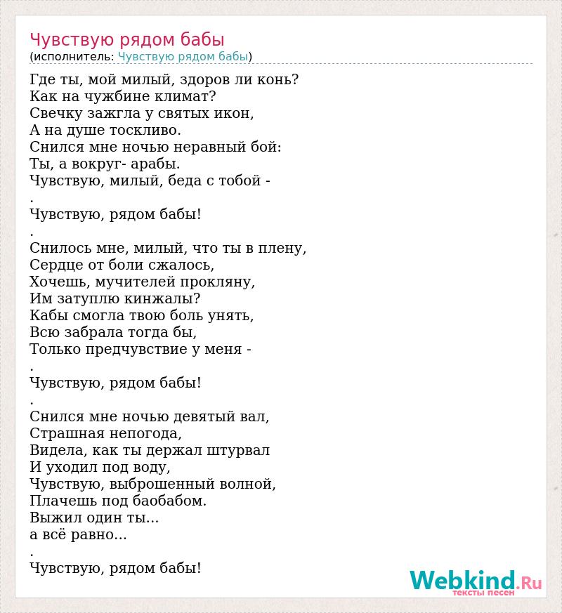 Где ты, мой милый, здоров ли конь? Как на чужбине климат? Свечку зажгла у святых икон, А на душе тоскливо. Снился мне ночью неравный бой: Ты, а вокруг- арабы. Чувствую, милый, беда с тобой - . Чувствую, рядом бабы! . Снилось мне, милый, что ты в плену, Сердце от боли сжалось, Хочешь, мучителей прокляну, Им затуплю кинжалы? Кабы смогла твою боль унять, Всю забрала тогда бы, Только предчувствие у меня - . Чувствую, рядом бабы! . Снился мне ночью девятый вал, Страшная непогода, Видела, как ты держал штурвал И уходил под воду, Чувствую, выброшенный волной, Плачешь под баобабом. Выжил один ты... а всё равно... . Чувствую, рядом бабы!