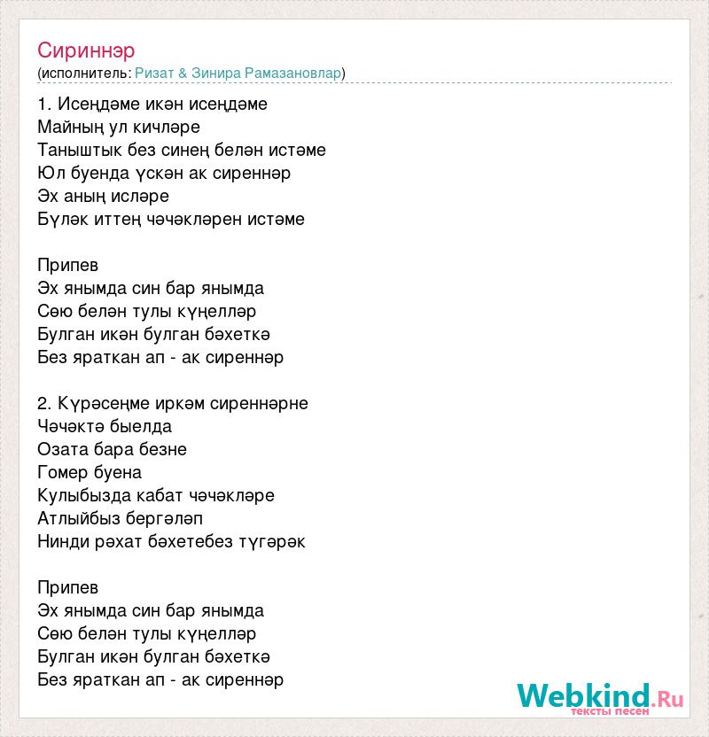 1. Исеңдәме икән исеңдәме Майның ул кичләре Таныштык без синең белән истәме Юл буенда үскән ак сиреннәр Эх аның исләре Бүләк иттең чәчәкләрен истәме Припев Эх янымда син бар янымда Сөю белән тулы күңелләр Булган икән булган бәхеткә Без яраткан ап - ак сиреннәр 2. Күрәсеңме иркәм сиреннәрне Чәчәктә быелда Озата бара безне Гомер буена Кулыбызда кабат чәчәкләре Атлыйбыз бергәләп Нинди рәхат бәхетебез түгәрәк Припев Эх янымда син бар янымда Сөю белән тулы күңелләр Булган икән булган бәхеткә Без яраткан ап - ак сиреннәр