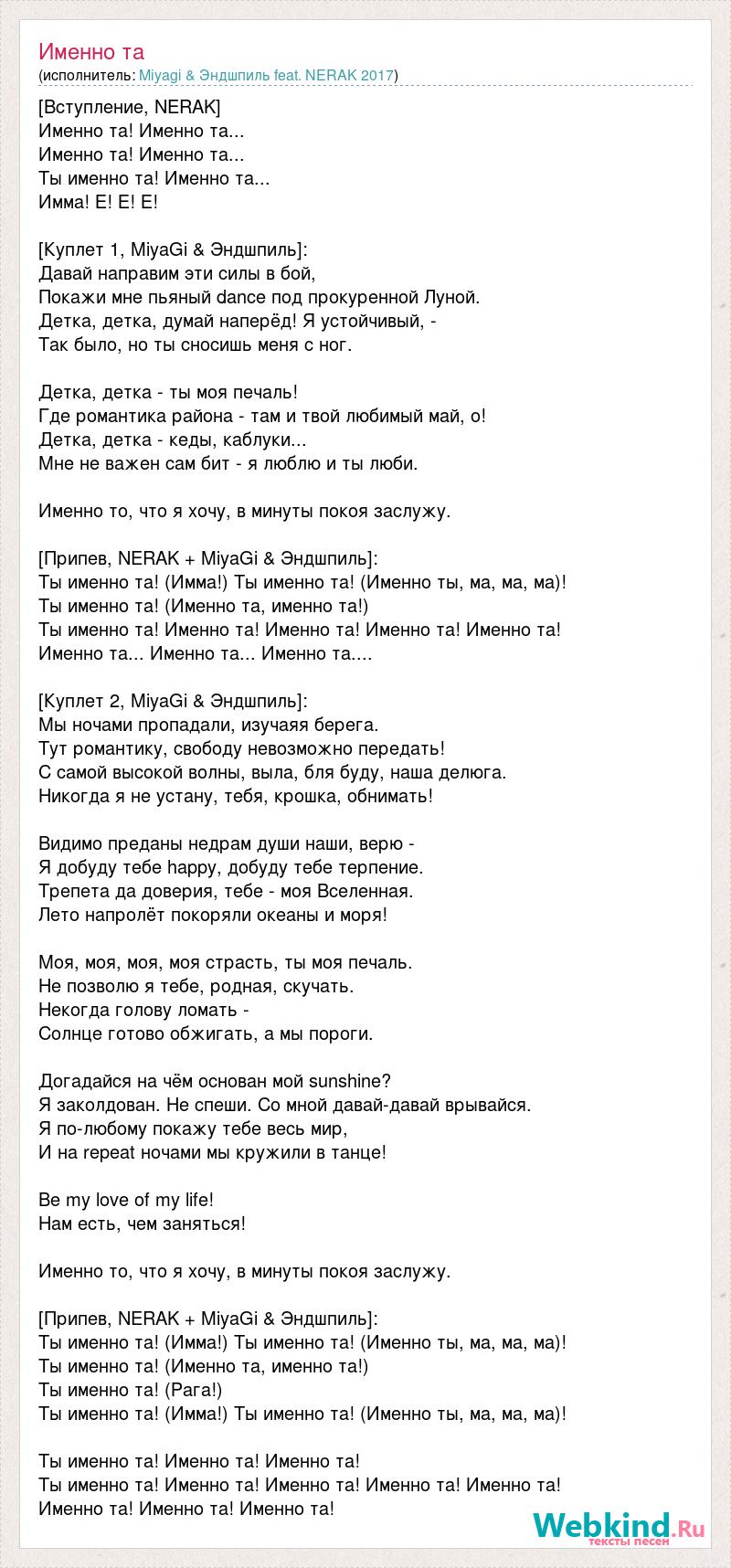 [Вступление, NERAK] Именно та! Именно та... Именно та! Именно та... Ты именно та! Именно та... Имма! Е! Е! Е! [Куплет 1, MiyaGi & Эндшпиль]: Давай направим эти силы в бой, Покажи мне пьяный dаnce под прокуренной Луной. Детка, детка, думай наперёд! Я устойчивый, - Так было, но ты сносишь меня с ног. Детка, детка - ты моя печаль! Где романтика района - там и твой любимый май, о! Детка, детка - кеды, каблуки... Мне не важен сам бит - я люблю и ты люби. Именно то, что я хочу, в минуты покоя заслужу. [Припев, NERAK + MiyaGi & Эндшпиль]: Ты именно та! (Имма!) Ты именно та! (Именно ты, ма, ма, ма)! Ты именно та! (Именно та, именно та!) Ты именно та! Именно та! Именно та! Именно та! Именно та! Именно та... Именно та... Именно та.... [Куплет 2, MiyaGi & Эндшпиль]: Мы ночами пропадали, изучаяя берега. Тут романтику, свободу невозможно передать! С самой высокой волны, выла, бля буду, наша делюга. Никогда я не устану, тебя, крошка, обнимать! Видимо преданы недрам души наши, верю - Я добуду тебе happy, добуду тебе терпение. Трепета да доверия, тебе - моя Вселенная. Лето напролёт покоряли океаны и моря! Моя, моя, моя, моя страсть, ты моя печаль. Не позволю я тебе, родная, скучать. Некогда голову ломать - Солнце готово обжигать, а мы пороги. Догадайся на чём основан мой sunshine? Я заколдован. Не спеши. Со мной давай-давай врывайся. Я по-любому покажу тебе весь мир, И на repeat ночами мы кружили в танце! Be my love of my life! Нам есть, чем заняться! Именно то, что я хочу, в минуты покоя заслужу. [Припев, NERAK + MiyaGi & Эндшпиль]: Ты именно та! (Имма!) Ты именно та! (Именно ты, ма, ма, ма)! Ты именно та! (Именно та, именно та!) Ты именно та! (Рага!) Ты именно та! (Имма!) Ты именно та! (Именно ты, ма, ма, ма)! Ты именно та! Именно та! Именно та! Ты именно та! Именно та! Именно та! Именно та! Именно та! Именно та! Именно та! Именно та!