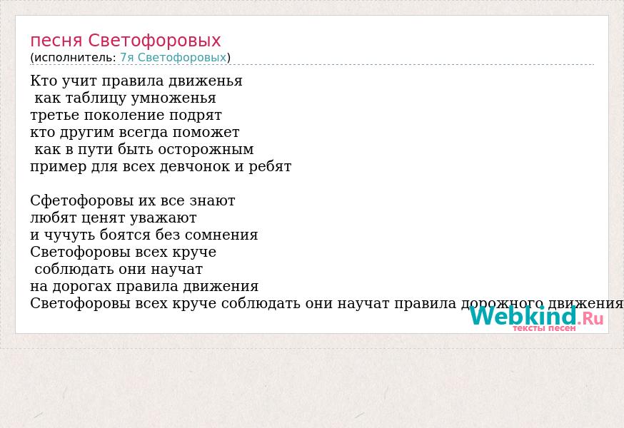 Кто учит правила движенья как таблицу умноженья третье поколение подрят кто другим всегда поможет как в пути быть осторожным пример для всех девчонок и ребят Сфетофоровы их все знают любят ценят уважают и чучуть боятся без сомнения Светофоровы всех круче соблюдать они научат на дорогах правила движения Светофоровы всех круче соблюдать они научат правила дорожного движения