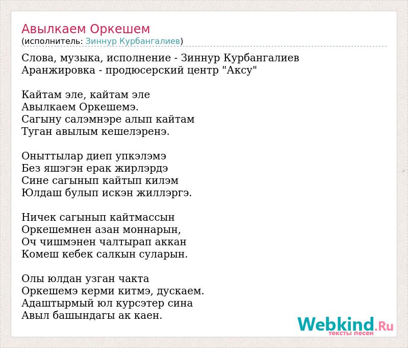 Слова, музыка, исполнение - Зиннур Курбангалиев Аранжировка - продюсерский центр "Аксу" Кайтам эле, кайтам эле Авылкаем Оркешемэ. Сагыну салэмнэре алып кайтам Туган авылым кешелэренэ. Оныттылар диеп упкэлэмэ Без яшэгэн ерак жирлэрдэ Сине сагынып кайтып килэм Юлдаш булып искэн жиллэргэ. Ничек сагынып кайтмассын Оркешемнен азан моннарын, Оч чишмэнен чалтырап аккан Комеш кебек салкын суларын. Олы юлдан узган чакта Оркешемэ керми китмэ, дускаем. Адаштырмый юл курсэтер сина Авыл башындагы ак каен.