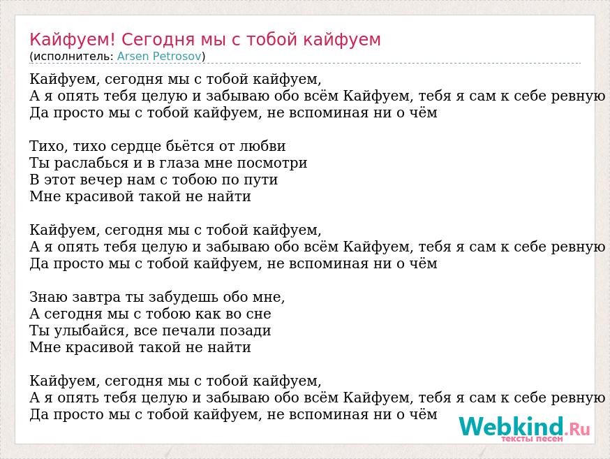 Кайфуем, сегодня мы с тобой кайфуем, А я опять тебя целую и забываю обо всём Кайфуем, тебя я сам к себе ревную Да просто мы с тобой кайфуем, не вспоминая ни о чём Тихо, тихо сердце бьётся от любви Ты раслабься и в глаза мне посмотри В этот вечер нам с тобою по пути Мне красивой такой не найти Кайфуем, сегодня мы с тобой кайфуем, А я опять тебя целую и забываю обо всём Кайфуем, тебя я сам к себе ревную Да просто мы с тобой кайфуем, не вспоминая ни о чём Знаю завтра ты забудешь обо мне, А сегодня мы с тобою как во сне Ты улыбайся, все печали позади Мне красивой такой не найти Кайфуем, сегодня мы с тобой кайфуем, А я опять тебя целую и забываю обо всём Кайфуем, тебя я сам к себе ревную Да просто мы с тобой кайфуем, не вспоминая ни о чём