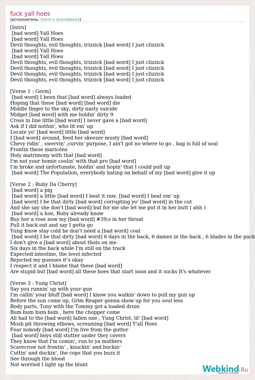 [Intro] [bad word] Yall Hoes [bad word] Yall Hoes Devil thoughts, evil thoughts, trizzick [bad word] I just clizzick [bad word] Yall Hoes [bad word] Yall Hoes Devil thoughts, evil thoughts, trizzick [bad word] I just clizzick Devil thoughts, evil thoughts, trizzick [bad word] I just clizzick Devil thoughts, evil thoughts, trizzick [bad word] I just clizzick Devil thoughts, evil thoughts, trizzick [bad word] I just clizzick [Verse 1 : Germ] [bad word] I been that [bad word] always loaded Hoping that these [bad word] [bad word] die Middle finger to the sky, dirty nasty suicide Midget [bad word] with me holdin' dirty 9 Cross in line little [bad word] I never gave a [bad word] Ask if I did nothin', who lit em' up Locate yo' [bad word] little [bad word] I [bad word] around, feed her skeezer musty [bad word] Chevy ridin' , swervin' ,curvin' purpose, I ain't got no where to go , bag is full of soul Frontin these maricóns Holy matrimony with that [bad word] I'm not your homie coolin' with that pro [bad word] I'm broke and unfortunate, holdin' and hopin' that I could pull up [bad word] The Population, everybody hating on behalf of my [bad word] give it up [Verse 2 : Ruby Da Cherry] [bad word] a pig [bad word] a little [bad word] I beat it raw, [bad word] I beat em' up [bad word] I be that dirty [bad word] corrupting yo' [bad word] in the cut And she say she don't [bad word] but for me she let me put it in her butt ( ahh ) [bad word] a hoe, Ruby already know Buy her a rose now my [bad word] #39;s in her throat Pull it back out and say I gotta go Yung $now stay cold he don't need a [bad word] coat [bad word] I be that dirty [bad word] 6 days in the back, 6 dames in the back , 6 blades in the pack I don't give a [bad word] about thots on me Six days in the back while I'm still on the track Expected intestine, the level infected Rejected my guesses it’s okay I respect it and I blame that these [bad word] Are stupid but [bad word] all these hoes that start soon and it sucks It's whatever [Verse 3 : Yung Christ] Say you runnin' up with your gun I'm callin' your bluff [bad word] I know you walkin' down to pull my gun up Before the sun come up, Grim Reaper gonna show up for you soul less Body parts, Tony with the Tommy got a loaded drum Bum bum bum bum , here the chopper come All hail to the [bad word] fallen one , Yung Christ, lil' [bad word] Mosh pit throwing elbows, screaming [bad word] Y'all Hoes Fear nobody [bad word] I'm live from the gutter [bad word] boys still stutter under they covers They know that I'm comin', run to ya mothers Scarecrow not frontin' , knuckin' and buckin' Cuttin' and duckin', the cops that you buzz it See through the blood Not worried I light up the blunt