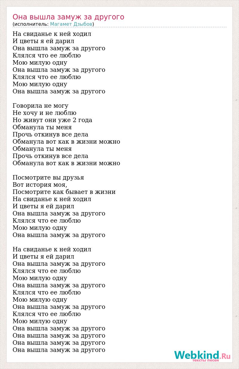 На свиданье к ней ходил И цветы я ей дарил Она вышла замуж за другого Клялся что ее люблю Мою милую одну Она вышла замуж за другого Клялся что ее люблю Мою милую одну Она вышла замуж за другого Говорила не могу Не хочу и не люблю Но живут они уже 2 года Обманула ты меня Прочь откинув все дела Обманула вот как в жизни можно Обманула ты меня Прочь откинув все дела Обманула вот как в жизни можно Посмотрите вы друзья Вот история моя, Посмотрите как бывает в жизни На свиданье к ней ходил И цветы я ей дарил Она вышла замуж за другого Клялся что ее люблю Мою милую одну Она вышла замуж за другого На свиданье к ней ходил И цветы я ей дарил Она вышла замуж за другого Клялся что ее люблю Мою милую одну Она вышла замуж за другого Клялся что ее люблю Мою милую одну Она вышла замуж за другого Клялся что ее люблю Мою милую одну Она вышла замуж за другого Она вышла замуж за другого Она вышла замуж за другого Она вышла замуж за другого